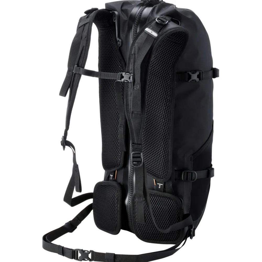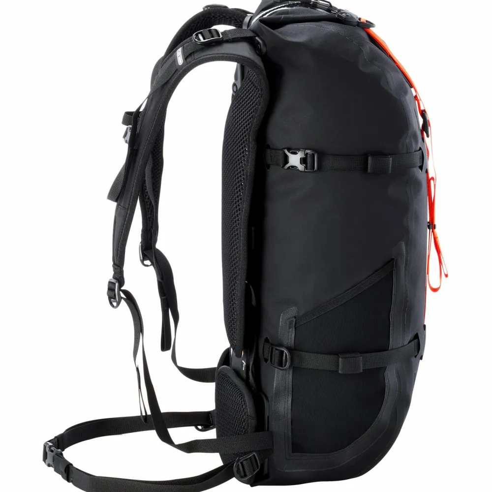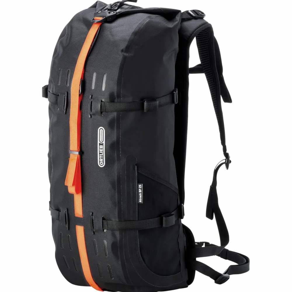 Der Atrack Bike 25 Bike-Rucksack von Ortlieb ist ein modularer Active-Travelling-Rucksack, der sich perfekt für Bikepacking und viele andere sportliche Outdooraktivitäten eignet. Mit seinem bewegungsfreundlichen Tragesystem aus gepolstertem Rückenbereich, Schulterträgern und abnehmbarem Hüftgurt trägt sich der Bike-Rucksack bequem beim Radfahren und Wandern. Er verfügt über eine große Reißverschlussöffnung im Rückenpolster und abnehmbare Kompressionsriemen. Die Rückenlänge lässt sich beim Atrack Bike 25 individuell einstellen und sorgt so für optimalen Sitz. Die wasserdichte Konstruktion ergänzt Ortlieb mit einem hermetisch abgedichteten Durchlass für ein Trinksystem. Insgesamt 25 Liter Stauraum bietet der wasserdichte Rucksack und sorgt im Inneren mit vier Innentaschen, Innenkompression und Schlüsselhaken für praktische Aufbewahrungsmöglichkeiten. Der Atrack Bike 25 Bike-Rucksack ist wetterfest nach den IP 67 Kriterien und hält auch kräftigen Regenschauern dauerhaft stand.