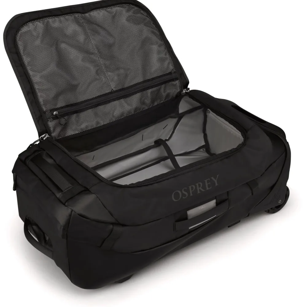 Begib Dich auf eine große Reise mit dem Rolling Transporter 90 von Osprey. Kein Flughafenboden, kein Gepäckband oder schlechtes Wetter kommt dieser Reisetasche in die Quere, durch das stark wasserabweisende und sehr robuste Material sind Deine Habseligkeiten immer sicher und trocken verstaut. Leichtes Ziehen wird ermöglicht durch den ErgoGrip-Griff, den extra großen Rollen und dem HighRoad Gestell, egal welche Untergründe oder Bedingungen, der Rolling Transporter ist ein richtiger Geländewagen unter den Reisetaschen. Die Reisetasche kann wie ein Koffer seitlich geöffnet werden und durch die Meshfächer und den Kompressionsriemen wird ein organisiertes und faltenfreies Packen garantiert. Das extra zugängliche Außenfach bietet Platz für Reisepass und Flugtickets. Perfekt!