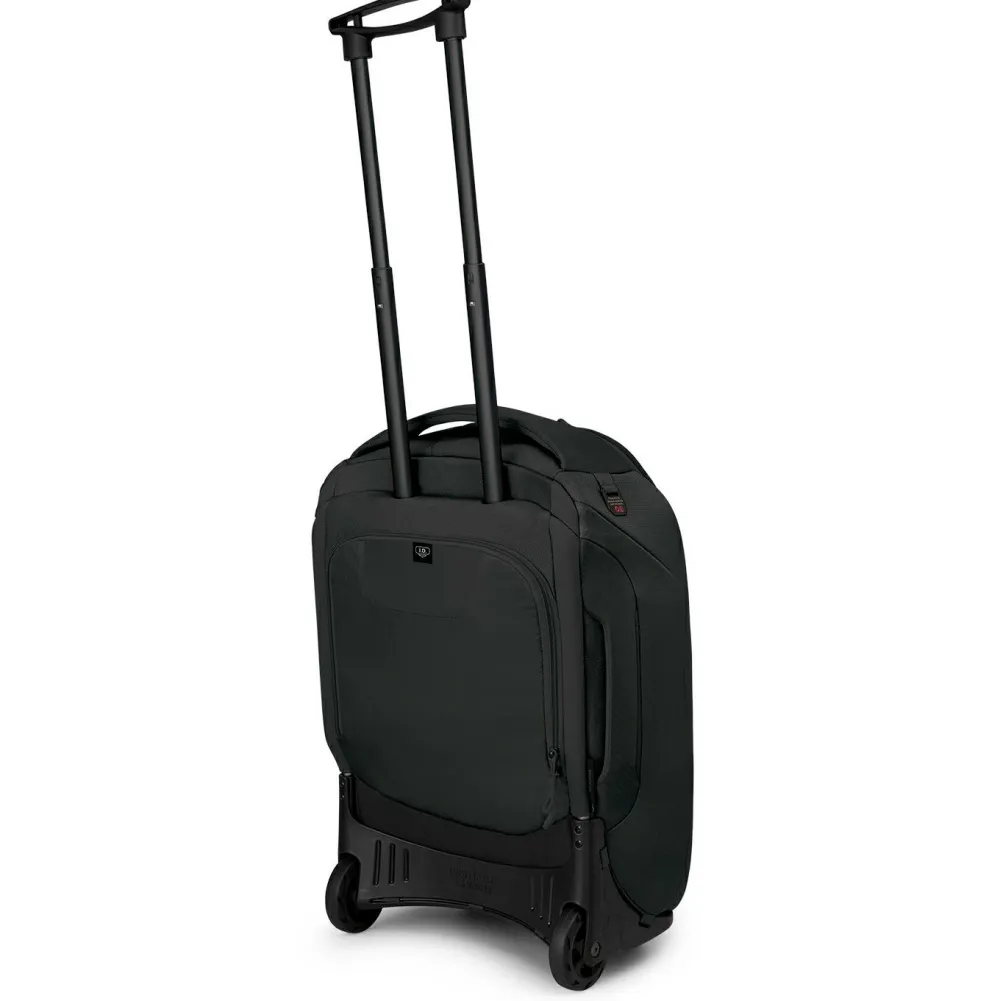 Durch den ausziehbaren Teleskopgriff und den robusten Aluminium-Rahmen lässt sich die Shuttle 45 von Osprey besonders komfortabel transportieren. Das Material für die Reisetasche stammt aus recycelten Fasern und ist nach dem nachhaltigen bluesign approved Standard zertifiziert.