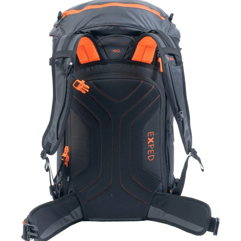 Der Rucksack ist mit seiner Farbgebung selbst im dichtesten Schneegestöber jederzeit bestens sichtbar. Der Boden sowie die Vorderseite sind zusätzlich mit EVA-Schaumstoff verstärkt. Das geräumige 30 Liter Hauptfach ist zur besseren Übersicht hell gestaltet. Das Hauptfach ist sowohl von oben als auch über ein umlaufendes Zip-System am Rücken zugänglich. So kann der Rucksack im Schnee liegend geöffnet werden, ohne dass das Rückenteil nass wird. Ein schnell zugängliches Frontfach für die Lawinenausrüstung ist ebenso am Start wie zwei frei positionierbare Befestigungen für Eispickel und zusätzliche Riemen und eine Hüftgurttasche. Die Ski lassen sich unter dem Deckelfach, seitlich oder diagonal befestigen. Der Couloir 30 ist zudem kompatibel mit dem separat erhältlichen Exped Mesh Helmet Holder. Klasse!