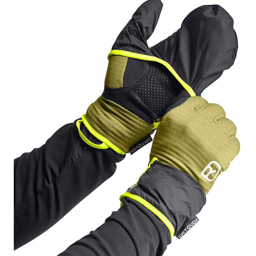 Der integrierte Cover-Hoody macht die Handschuhe zu einem echten Allroundtalent. Er lässt sich schnell und einfach herausholen und über die Finger ziehen. Dadurch sind die Hände zusätzlich vor Kälte, Schnee und Wind geschützt. Die Silikonbeschichtung an den Handinnenseiten sorgt für Grip. Die Skistöcke liegen dadurch fest und sicher in den Händen. Dank des Smartfingers kann das Touchscreen sogar mit den Handschuhen bedient werden. Die Anziehhilfe sorgt dafür, dass der Handschuhe kinderleicht angezogen werden kann. Handschuhe für alle, die es praktisch mögen – die Fleece Grid Cover Glove Handschuhe von Ortovox.Das Wichtigste im Überblick: