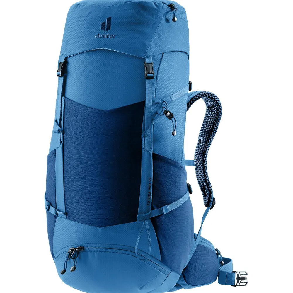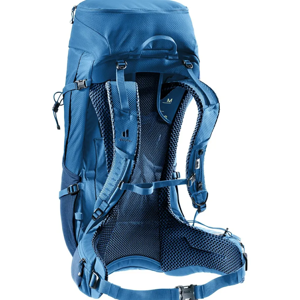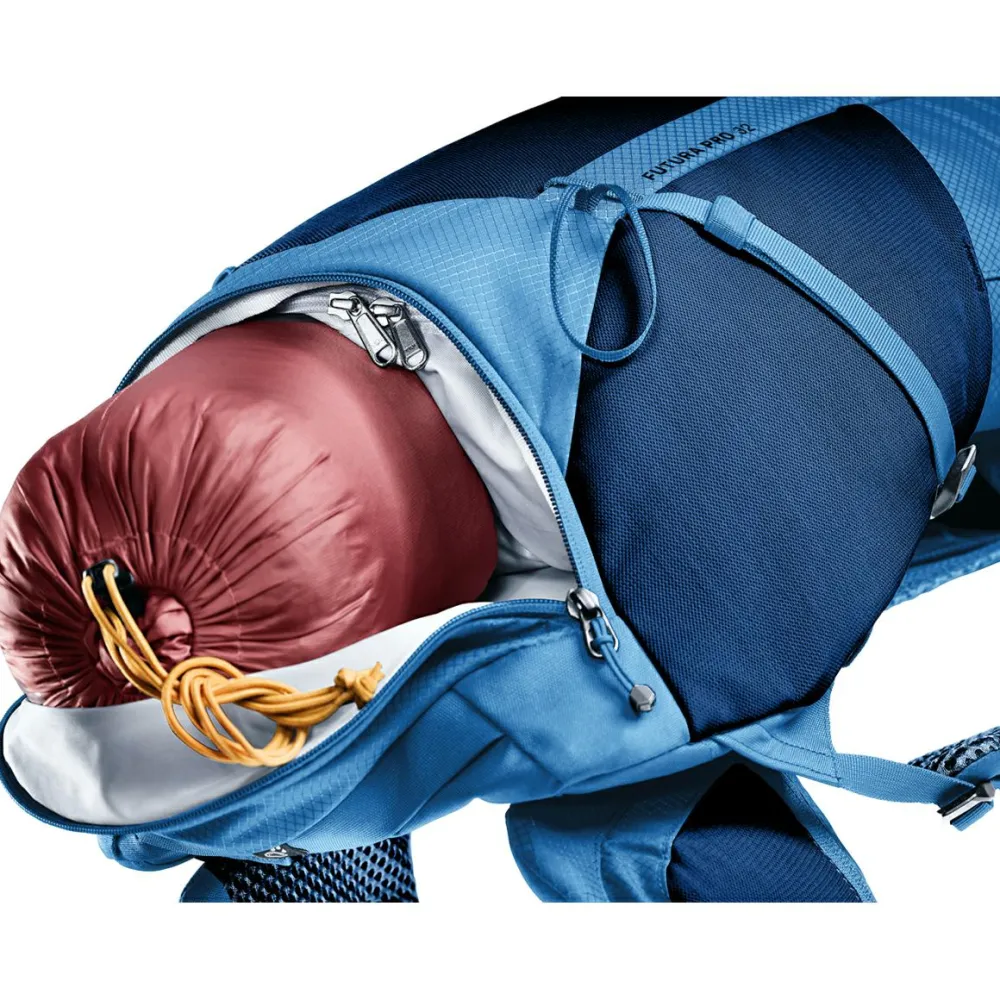 Der Futura Pro 32 Wanderrucksack von Deuter kommt mit gepolsterten und belüfteten Schulter- und Hüftträgern daher und bietet auf anstrengenden Wanderungen einen hervorragenden Tragekomfort. Wenn es zu anstrengenden und schweißtreibenden Anstiegen kommt, kann die entstehende Feuchtigkeit direkt verdunsten und Du profitierst von einer dauerhaften Luftzirkulation am Rücken. Im Innern kannst Du mit einem aufklappbaren Zwischenboden eine Unterteilung des Stauraums vornehmen.