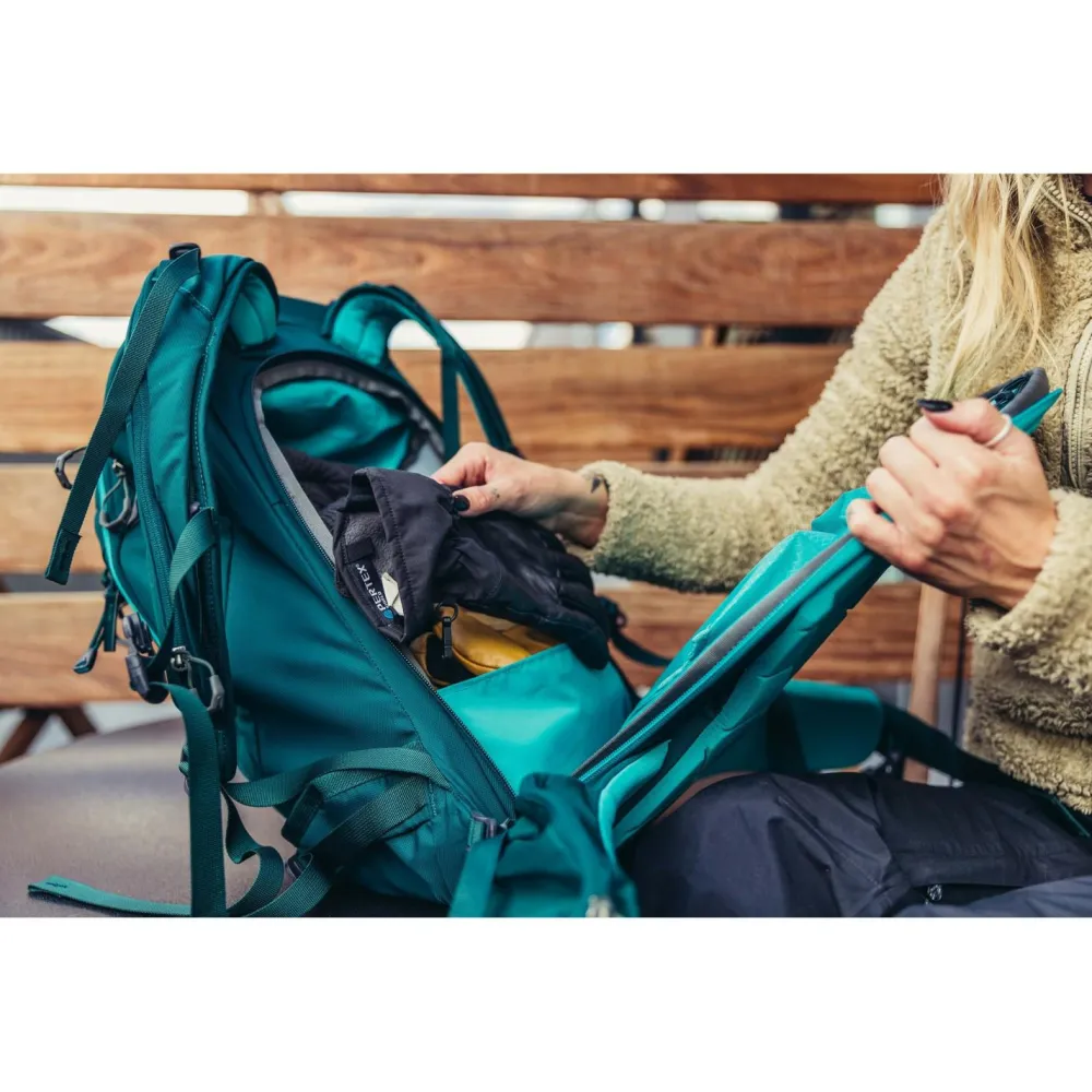 Die gepolsterten Schultergurte mit isolierter Trinkschlauchführung, der Hüftgurt mit Eisclipper-Halterung und das U-Zip-Rückenpanel mit schneeabweisender Oberfläche machen den Women’s Targhee 30 zu einem zuverlässigen Begleiter – auch bei Schneefall und Minusgraden.