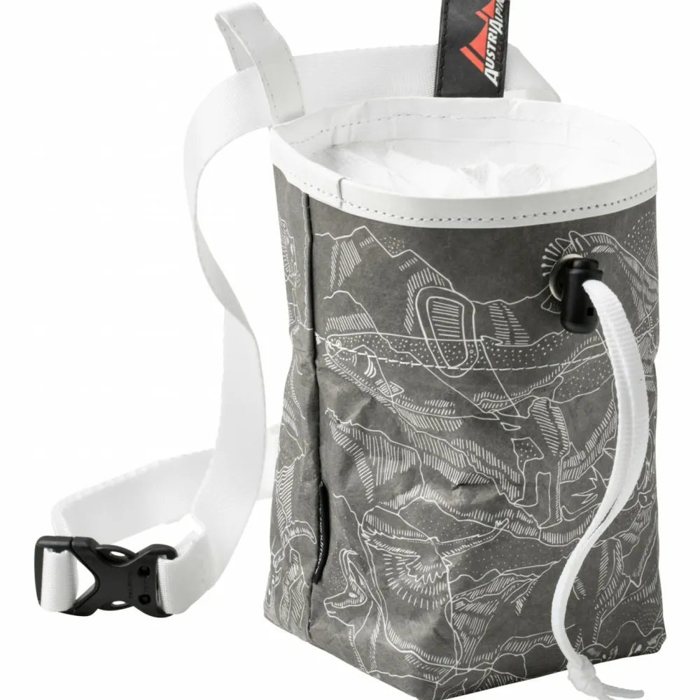 Bestehend aus einem Spezialpapier rein europäischen Ursprungs und gefertigt in Österreich ist dieses Minimalgewicht möglich. Trotz des leichten Gewichts ist das Material sehr abriebfest und auch gegen Felskontakt gewappnet. Außerdem ist das Material wasserdicht, vegan und kann in der Waschmaschine gewaschen werden. Im Inneren ist der Chalkbag mit Neopren ausgestattet, durch das kein Chalk in den Zwischenraum von Außen- und Innenmaterial gelangen kann. Dank des Neoprenmaterials verteilt sich das Chalk gleichmäßig im Chalkbag und wird sauber an die Finger abgegeben.