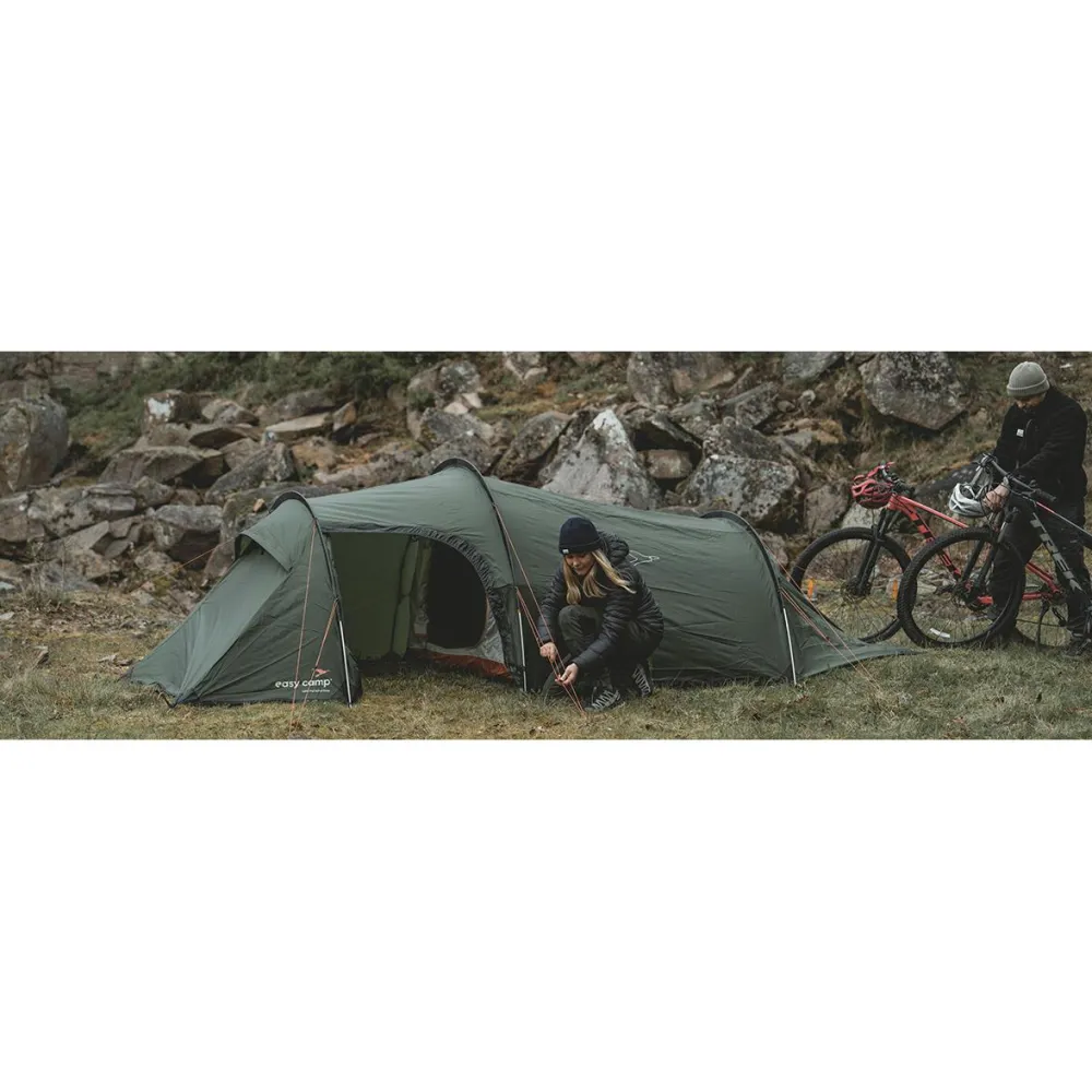 Das leichte Pasvik 3-Personen-Zelt von Easy Camp ist eine wirklich vielseitige Ergänzung Deiner Outdoor-Ausrüstung. Denn das Tunnelzelt ist sowohl bei Treks gut aufgehoben, als auch als Begleitung bei einer Bikepacking-Tour. Denn es lässt sich auch am Fahrradrahmen befestigen, und die mitgelieferte Packtasche ist wasserdicht und kommt mit Schnallen zur Befestigung am Rad.