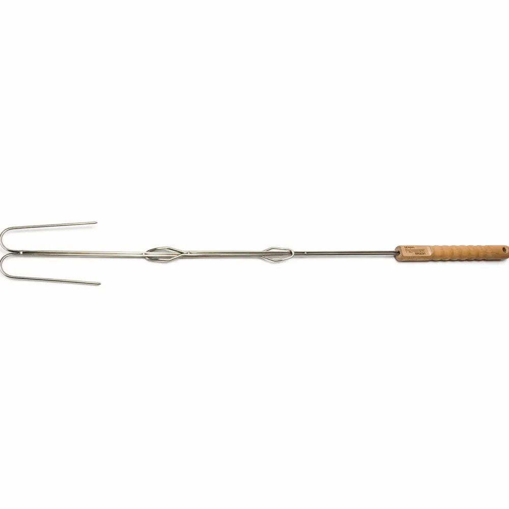 Mit diesem Lagerfeuerspieß kann man sicher seine Würstchen, sein Gemüse, sein Stockbrot oder auch seine Marshmallows grillen. Die Zinken von diesem Spieß sind nach hinten gebogen, damit das Grillgut so gut wie gar nicht herunterfallen kann. Deshalb ist er auch besonders gut für Kinder geeignet. Da der Spieß aus rostfreiem Edelstahl gefertigt wurde, kann er auch ganz einfach gereinigt werden. Der Griff ist aus Buchenholz gefertigt und die feinen Rillen des Griffs sorgen dafür, dass er sicher in der Hand liegt. Mit diesem Lagerfeuerspieß hat man immer genug Abstand zum Feuer und kann in Ruhe grillen, ohne dass man zu nah ans Feuer kommt.