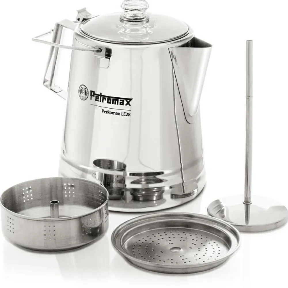 Mit der Kanne Perkolator Perkomax von Petromax gelingt besonders aromatischer Kaffee oder Tee. Die Kanne kann sowohl am Lagerfeuer, in der Outdoor-Küche oder am heimischen Herd eingesetzt werden. Am stabilen Henkel lässt er sich gut aufhängen. Durch einen gläsernen Knauf kann der Kochvorgang beobachtet werden.