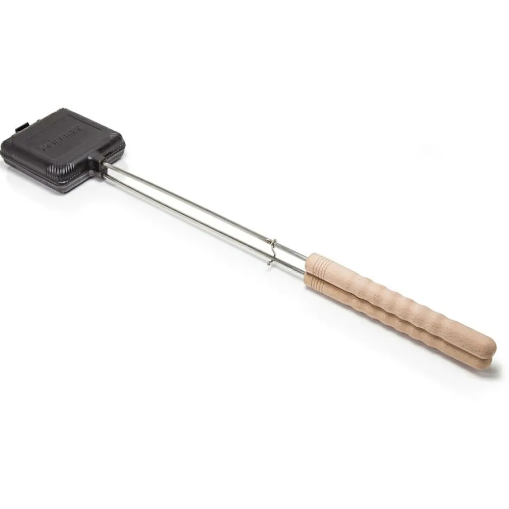 Ein gelungenes Essen garantiert das Sandwich-Eisen von Petromax! Der Verschlusshaken hält die Hälften der Eisen sicher zusammen. Die Materialeigenschaften des Gusseisens ermöglichen sowohl das Anbraten als auch das Nutzen der Restwärme zum Ausbacken oder Garen. Der Stiel hält Deine Hand in sicherem Abstand zum Feuer.
