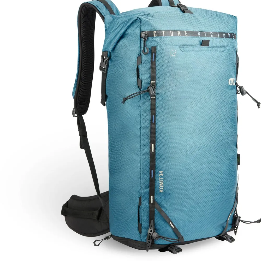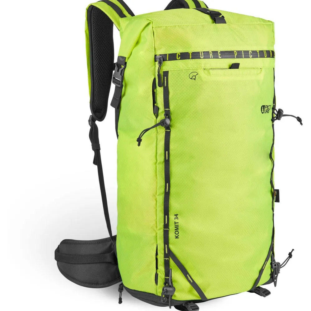 Der Komit.Tr 34 Backpack ist mit gepolsterten Schulterträgern, Brustgurt und abnehmbarem Hüftgurt ausgestattet. Ein weiches Innenfach mit Fleecepolster bietet Platz für Kamera, Smartphone oder Sonnenbrille. Picture fertigt den Tourenrucksack aus robustem Cordura 210D Ripstop Nylon und verwendet dafür 100% recycelte Rohstoffe. Eine wasserabweisende und PFC-freie Oberflächenbehandlung ergänzt den sportlichen Alpinrucksack für Skifahrer, Bergsteiger, Snowboarder und Skitourengeher.
