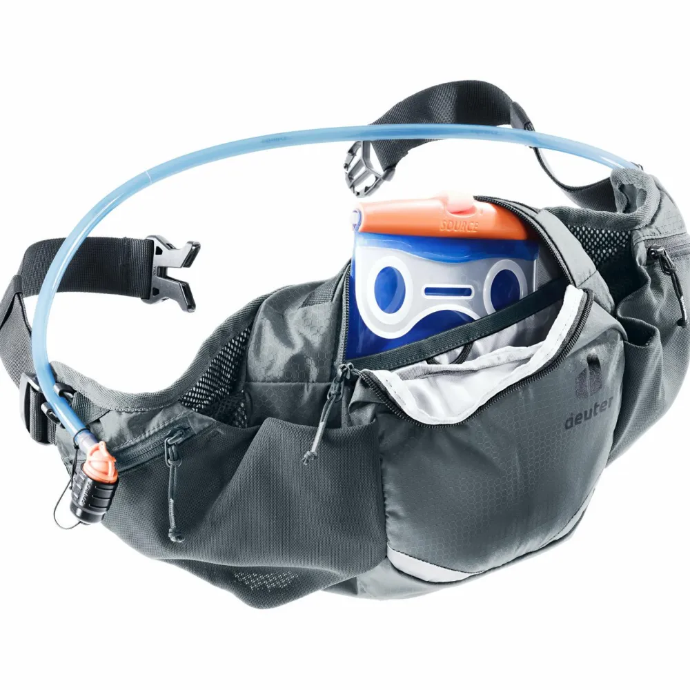 Die Pulse 3 Hüfttasche von deuter wurde speziell für Radtouren konstruiert und überzeugt mit hohem Tragekomfort. Der Hüftgurt lässt sich selbst während der Fahrt bequem an Deine Taille anpassen. Im geräumigen Innenfach befindet sich Platz für Deine Wertsachen sowie weitere Bekleidung und Verpflegung. Zwei Reißverschlusstaschen am Hüftgurt sowie eine Mesh-Tasche für Dein Smartphone lassen keine Wünsche offen. Die deuter Pulse 3 Hüfttasche kann bei Bedarf mit einer Trinkblase genutzt werden.