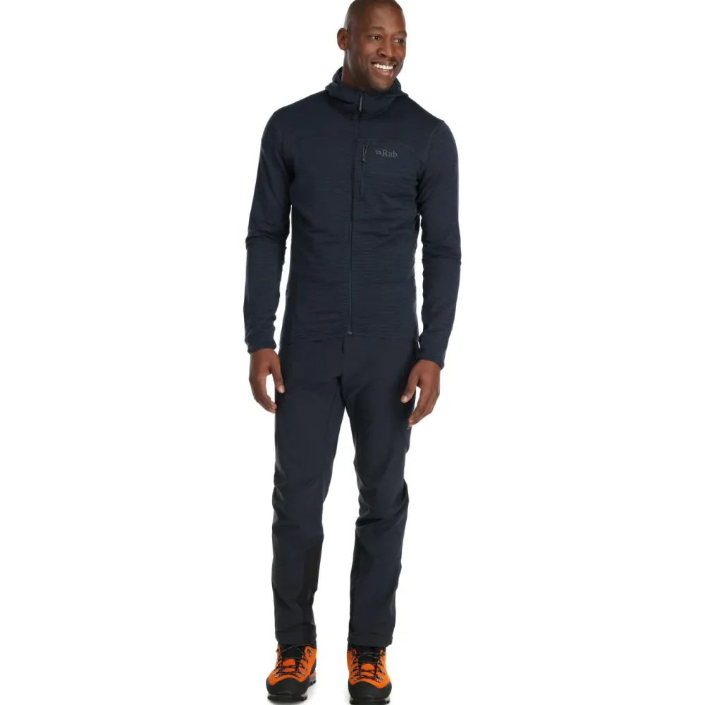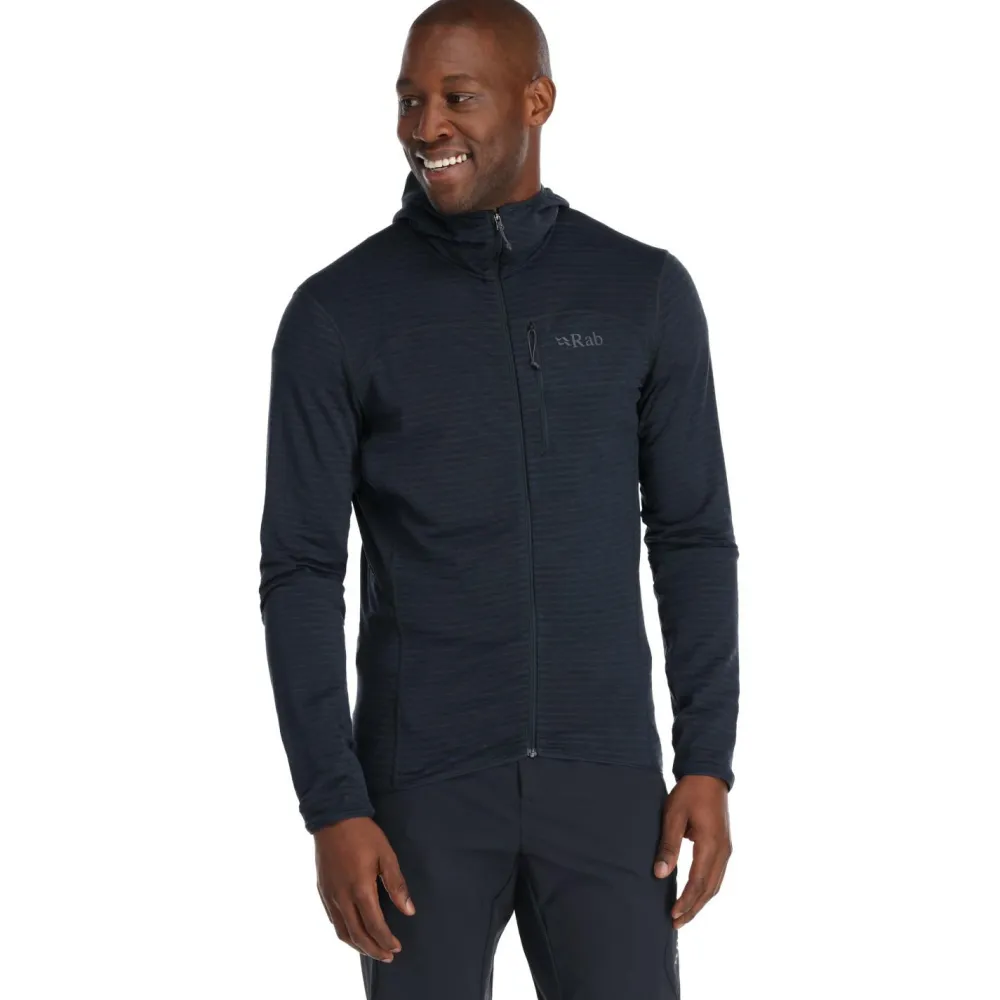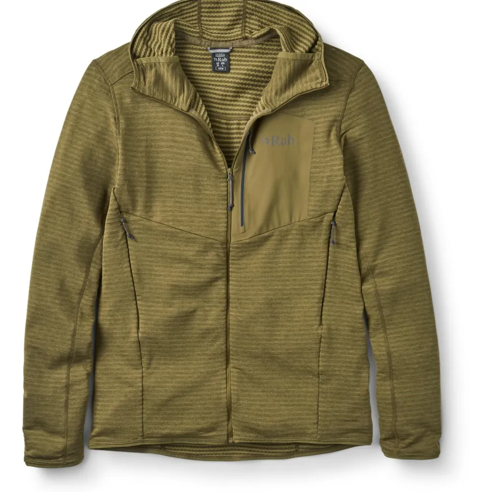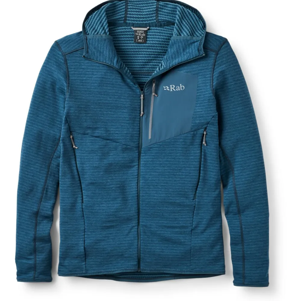 Der Ascendor Light Hoody von Rab ist ein vielseitig einsetzbarer Fleece-Midlayer mit einem Maximum an Bewegungsfreiheit. Er besteht aus extrem leichtem und dehnbarem Material und eignet sich daher perfekt für sportliche Outdoor-Aktivitäten wie Klettern oder Skibergsteigen, leistet aber auch beim Wandern und Bergsteigen gute Dienste. Das Fleece fühlt sich angenehm weich an und ist sehr atmungsaktiv. Außerdem verfügt die Jacke über eine elastische Kapuze und eine praktische Brusttasche mit Reißverschluss. Hier kannst Du kleinere Wertsachen sicher verstauen.
