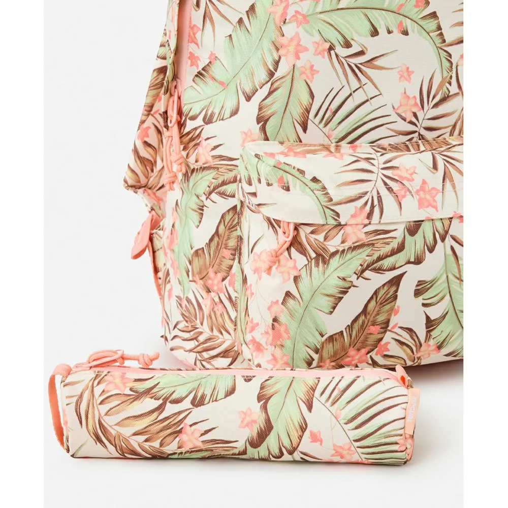 Der Women’s Dome 18 + PC Mixed von Rip Curl ist ein hervorragender Begleiter für jeden Tag. Dank der Verarbeitung von recyceltem Polyester ist er nachhaltig und damit gut für die Umwelt. Die verstellbaren und gepolsterten Schulterträger bieten höchsten Tragekomfort. Dank des Tragegriffes kannst Du den Rucksack auch mal schnell mit der Hand greifen. Das Frontfach mit Reißverschluss ist perfekt geeignet, um wichtige Kleinigkeiten wie Geld, Schlüssel und Handy zu verstauen. Das florale Muster zieht schon von Weitem alle Blicke auf sich.