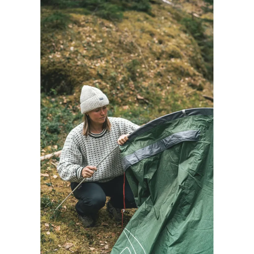 Der Auf- und Abbau geht dank des farbcodierten Aluminiumgestänges und der einseitig geschlossenen Hülsen zum Einstecken der Stangen schnell und einfach voran. Er kann mit dem Außenzelt zuerst beginnen oder mit eingehängtem Innenzelt als Ganzes erfolgen. Bei schönem Wetter kann das Außenzelt allein aufgebaut werden.