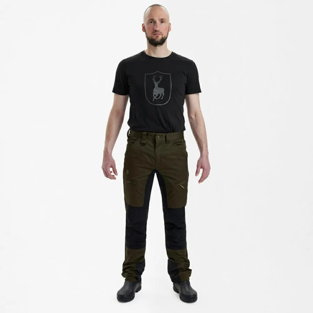Die Rogaland Stretch Trousers With Contrast von Deerhunter sieht schon auf den ersten Blick nach einem professionellen Begleiter für allerlei Abenteuer in der freien Natur aus. Die elastischen Eigenschaften der hochwertigen Materialien verhindern, dass Du bei anspruchsvollen Manövern eingeschränkt wirst. Gleichzeitig sind die strapazierfähigen Fasern auf Berührungen mit Ästen, Sträuchern und anderen Gegenständen eingestellt. Für einen optimalen Sitz der Hose sind Gürtelschlaufen angebracht, mit deren Hilfe ein unangenehmes Rutschen der Hose verhindert wird.