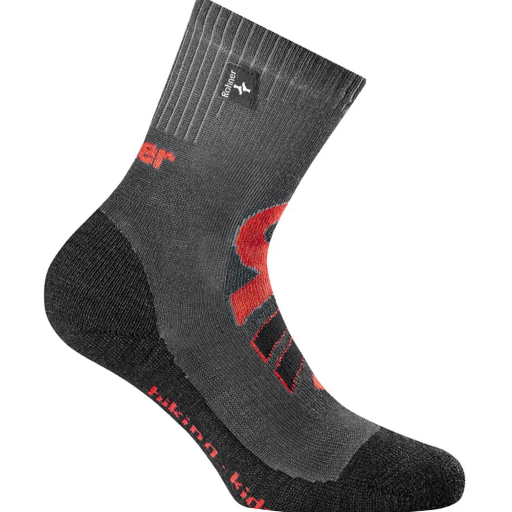 Perfekte Unterstützung für die Füße – die Rohner Hiking Kids! Die Trekkingsocken für Kinder sorgen dafür, dass die Kleinen unbeschwert den ganzen Tag in den Bergen unterwegs sein können. Der Materialmix aus Kunstfaser und natürlicher Merinowolle nimmt Feuchtigkeit von der Haut schnell auf und leitet sie nach außen ab. So bleiben die Füße trocken und Reibung auf der Haut wird vermieden. Durch eine schützende Polsterung an der Ferse, am Rist und am Schienbein sind die Füße bestens vor Druckstellen durch die Schuhe geschützt. Elastische Einsätze sorgen für eine optimale Passform und sorgen dafür, dass die Socken nah am Fuß anliegen. Durch einen Zehenbereich ohne Naht kann hier weniger Reibung entstehen und die Konstruktion beugt Blasen vor. Mit den Hiking Kids Trekkingsocken sind die Kleinen bei Tagesausflügen oder Wanderungen gut gepolstert unterwegs!Achtung: für die Socken gibt es eine eigene Größentabelle, die von der Standard-Tabelle des Herstellers abweicht.M = EU 27 – 30L = EU 31 – 34XL = EU 35 – 38