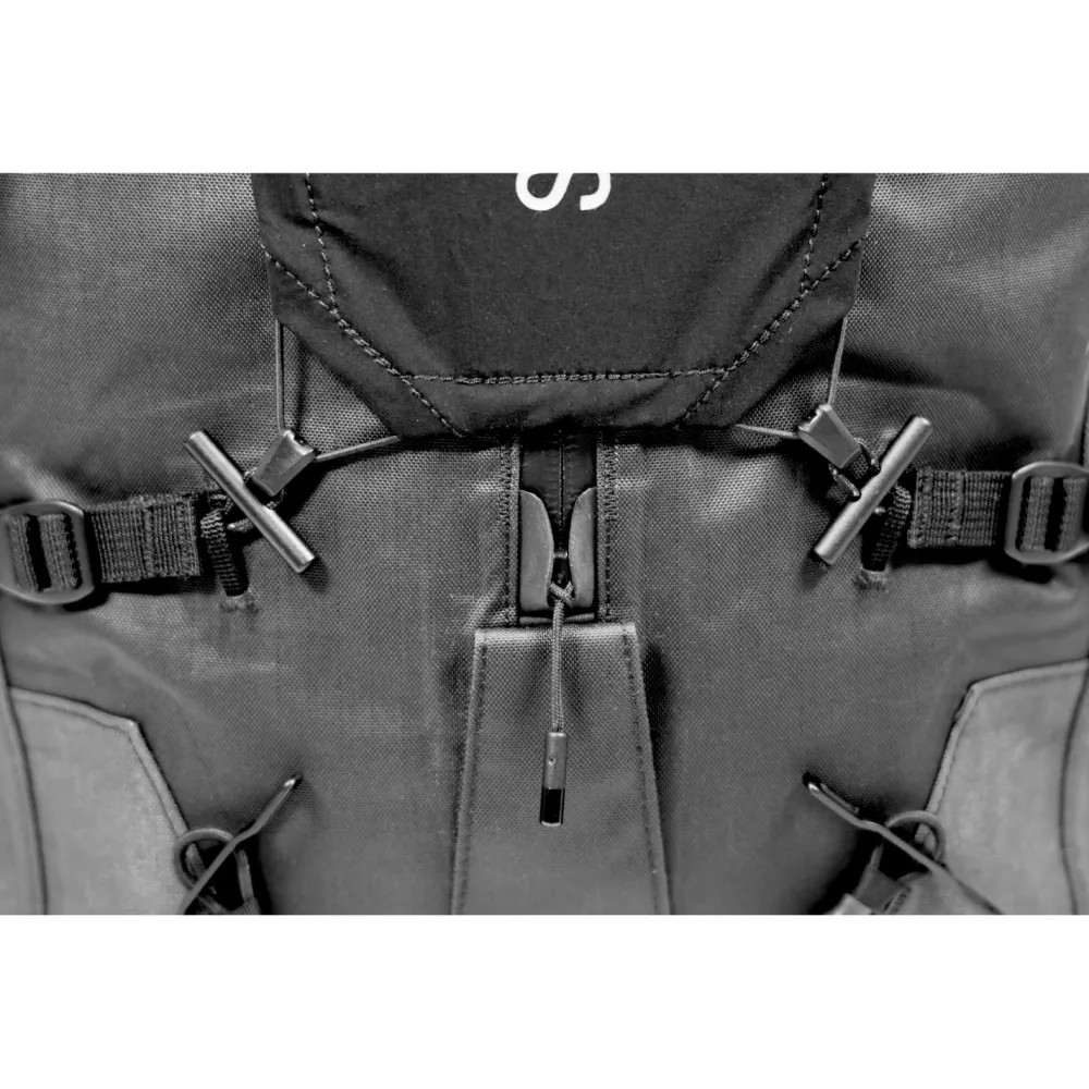 Sein Membrangewebe und die versiegelten Nähte sorgen dafür, dass der Rucksack wasserdicht ist. Die Verwendung von Dyneema setzt neue Maßstäbe in Sachen Robustheit. Der abnehmbare Hüftgurt und der thermogeformte Rücken bieten Komfort und Praktikabilität.