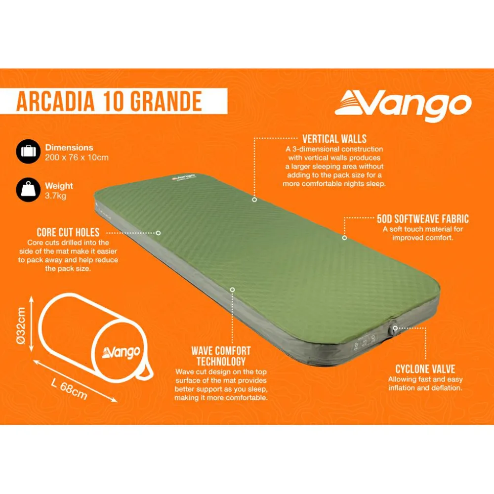 Die Arcadia 10 Grande-Isomatte von Vango bietet Dir ultimativen Komfort und eine hervorragende Isolation gegen Bodenkälte. Mit einer Dicke von 10 cm und einem R-Wert von 9.1 hält sie Dich auch bei kälteren Temperaturen warm. Die mit 200 x 76cm großzügig dimensionierte Isomatte bietet ausreichend Platz für zwei Personen. Dank des Cyclon-Ventils lässt sich die Matte schnell aufblasen und auch wieder ablassen, was Zeit und Mühe spart. Das 75D Non-Slip Polyester Base Fabric sorgt für eine strapazierfähige und rutschfeste Unterlage. Trotz ihres großzügigen Designs ist die Matte mit einem Gewicht von 3.7 kg und einem Packmaß von 77 x ø24cm leicht zu transportieren und zu verstauen.