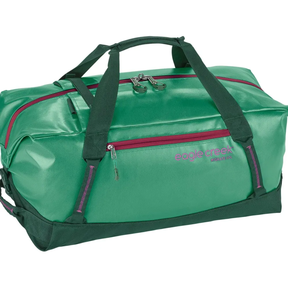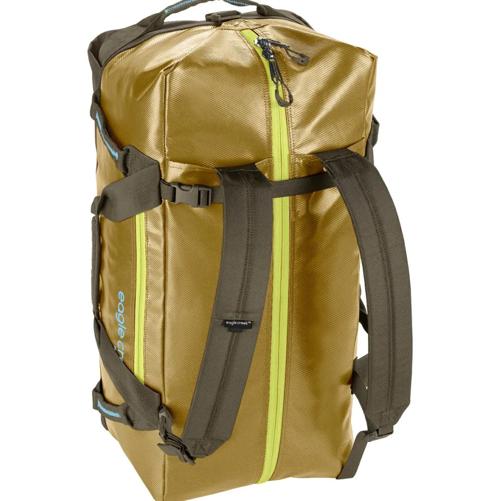 Die Migrate Duffel 60 L von eagle creek, ist eine robuste und gut durchdachte Reisetasche. Das Hauptfach ist durch einen großen Reisverschluss zugänglich, welcher abschließbar ist und durch eine große Schlaufe auch mit Handschuhen bedienbar ist. Zusätzlicher Stauraum kann man durch die Lösbaren Steckschließen gewinnen. Die Rucksackgurte lassen sich schnell und einfach verstauen. Durch spezielle Techniken ist die Tasche wasserbeständig, abriebfest und Staubresistent. Zum Aufbewahren kannst Du die recycelte Migrate Duffel 60 L klein zusammen falten.