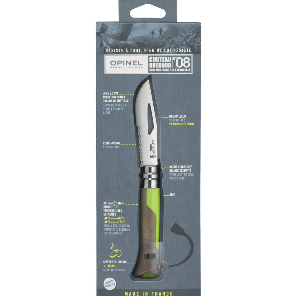 Ein praktischer Helfer bei Outdoor-Einsätzen aller Art – das Opinel Outdoormesser Nr. 8 (8,2 cm)! Das Messer mit robustem Griff inklusive einer Signalpfeife ist ideal zum Bergsteigen, unterwegs auf Trekkingtouren oder auch auf dem Wasser. Die scharfe Klinge ist teilweise mit einer Sägezahnung versehen und der integrierte Schäkelöffner erweitert die Einsatzmöglichkeiten! Durch das Virobloc System lässt sich die Klinge sowohl im geöffneten als auch im geschlossenen Zustand sicher fixieren. Mittels der Kordel aus Kunststoff kann das Messer am Gürtel, Rucksack oder an einem Karabiner befestigt werden!