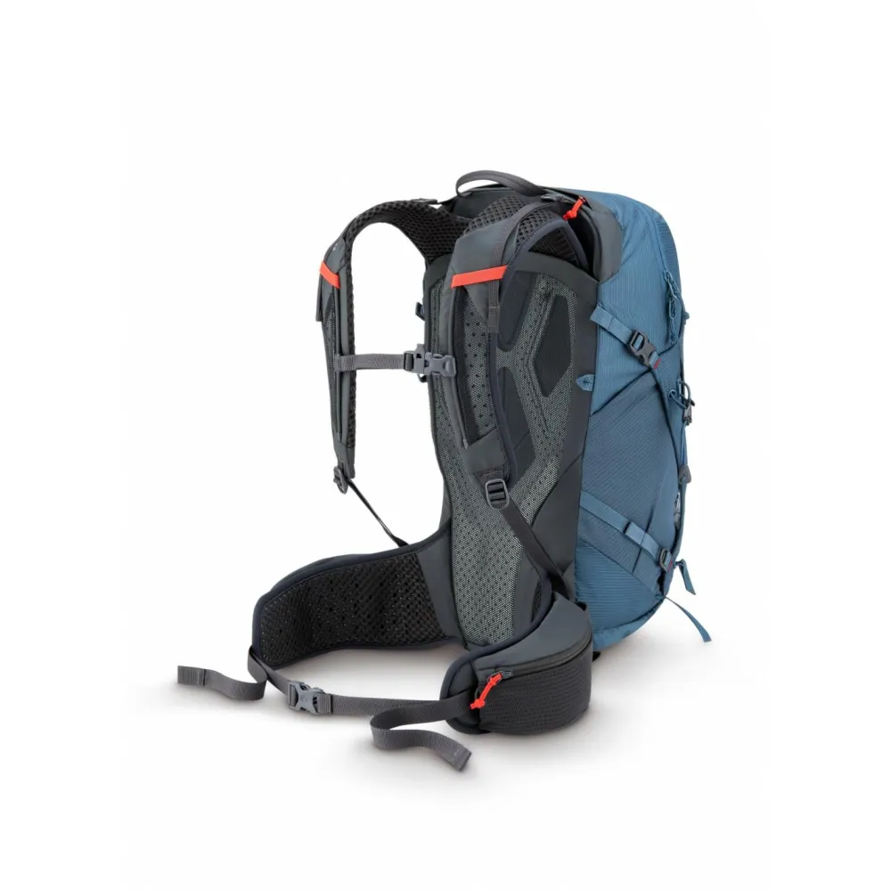 Dank verstellbarer Rückenlänge, Hüftgurt mit Zipper-Taschen und großen Mesh-Fächern hast Du schnellen Zugriff auf Snacks, Ausrüstung oder Wertsachen. Die integrierte Regenhülle schützt bei wechselhaftem Wetter, während die Stockhalterung mit Bungee-System Deine Ausrüstung sicher fixiert.
