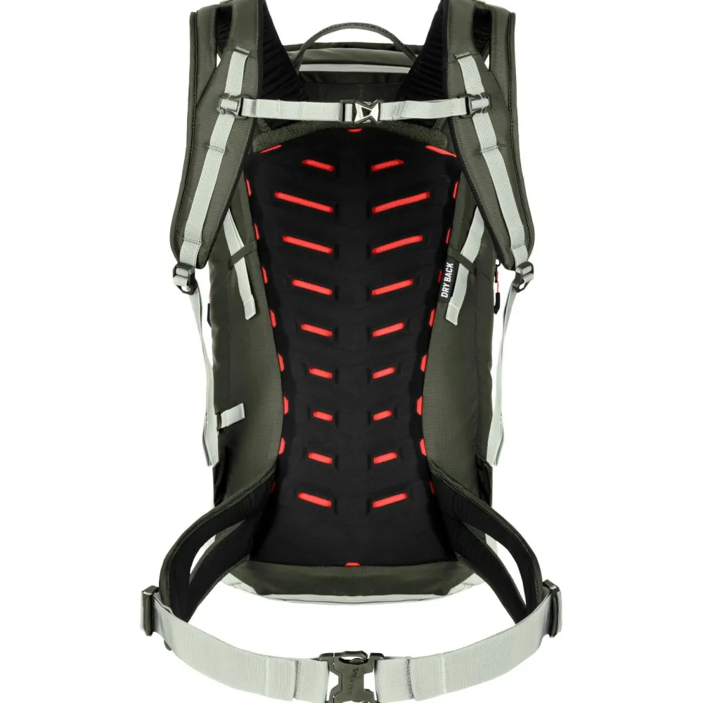 Das einfach verstellbare Dry Back Custom-Tragesystem verfügt über eine 3D-Kanal-Belüftung und ergonomisch geformte, gepolsterte, geteilte Schultergurte. Rückenlänge und Passform können individuell eingestellt werden. Außerdem gewährleisten die Lastkontrollriemen und der geteilte Hüftgurt eine gute Gesamtstabilität und eine gute Lastübertragung auf die Hüften. Zwei Seitentaschen, ein Ausgang für das Trinksystem, eine Daisy-Chain-Befestigung, eine Sicherheitstasche für Wertsachen mit Schlüsselhalter und eine seitliche Reißverschlusstasche für die Trinkflasche runden das durchdachte Design ab. Für einen eventuellen Wettersturz verfügt der Puez über wasserabweisende Reißverschlüsse und einen eigenen Regenschutz, der mitgeliefert wird.