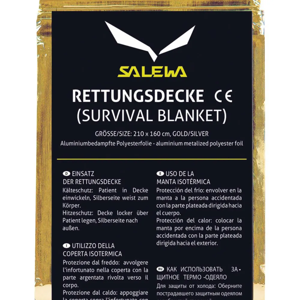 Die Salewa Rescue Blanket ist eine klassische Rettungsdecke, wie sie in keinem Touren- und Trekkingrucksack fehlen darf: im Notfall schützt die gold-silberne Beschichtung der mit Aluminium bedampften Polyamiddecke gleichermaßen vor Unterkühlung wie Überhitzung, mit einer Größe von 210 x 160 cm bietet sie ausreichend Platz um einen Erwachsenen sicher zu umhüllen.