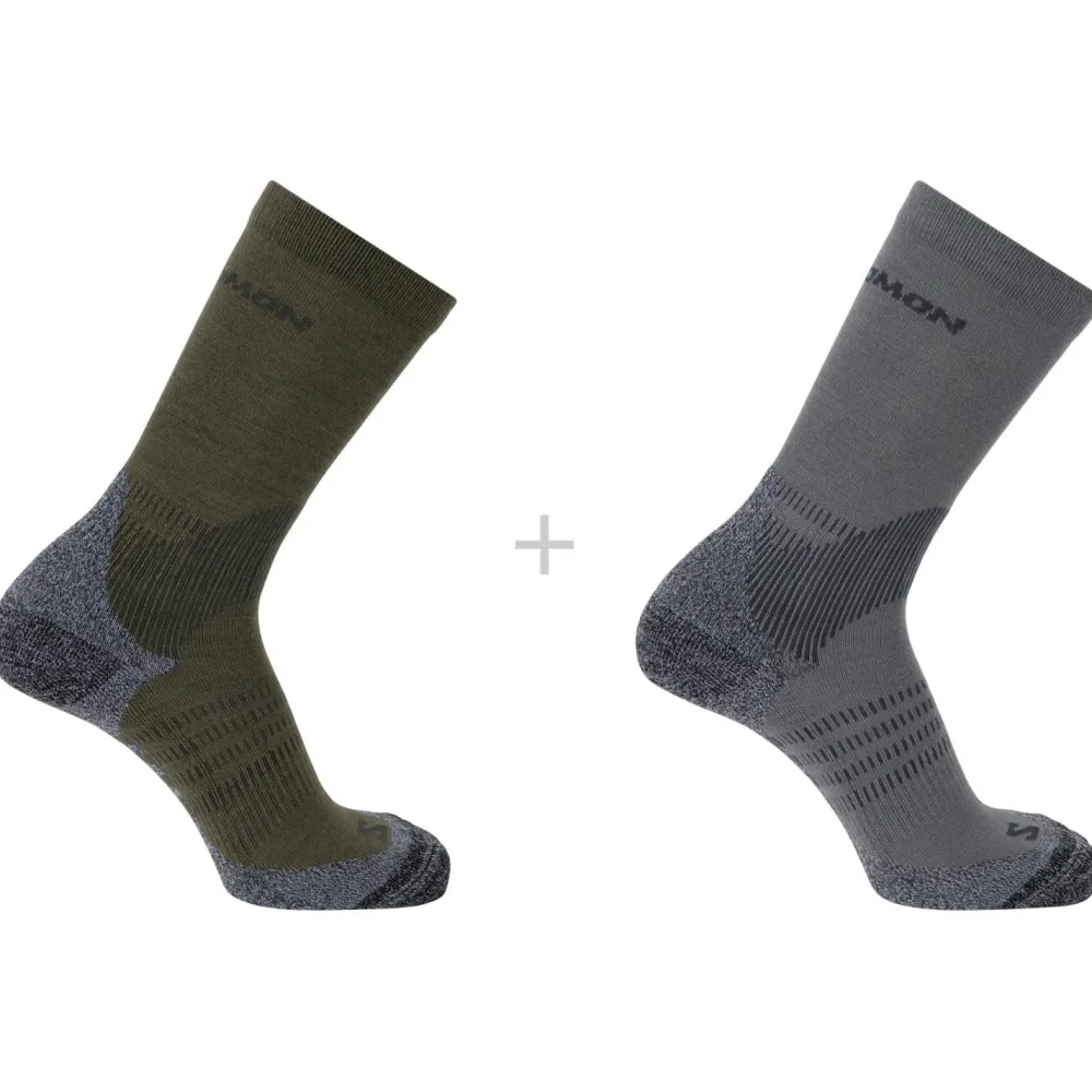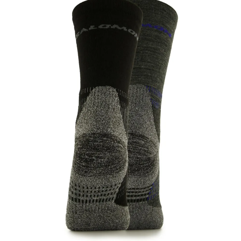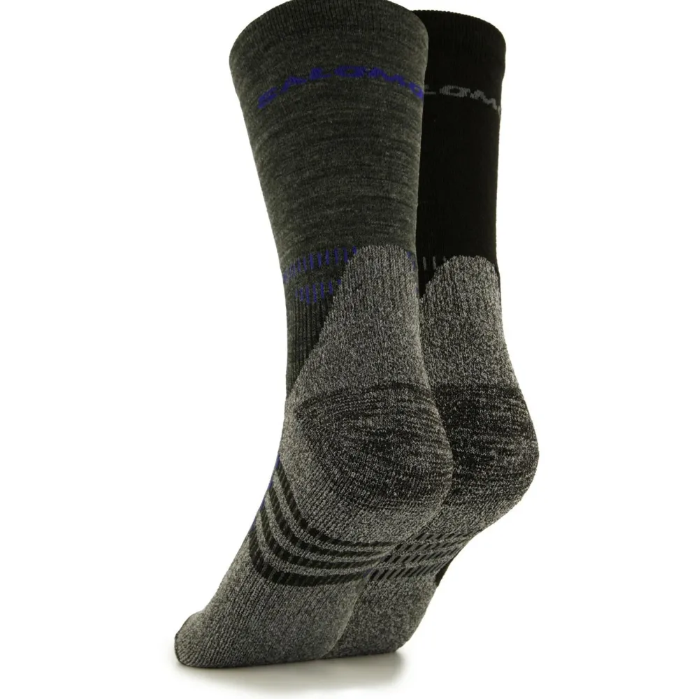 Socken für lange Wanderungen – die X Ultra Access Crew 2-Pack von Salomon. Die langen Wandersocken überzeugen durch einen funktionellen Materialmix aus Merinowolle und Kunstfasern. Durch die Merinowolle wird im Sommer Feuchtigkeit nach außen abgeleitet und im Winter wird die Wärme an den Füßen gehalten. Die gepolsterte Sohle aus einem Kunstfasermaterial bietet Dir angenehme Dämpfung und sorgt für ein tolles Tragegefühl. Durch die Auslegung als lange Wandersocken tragen sich die X Ultra Access Crew 2-Pack von Salomon auch in hohen Wanderschuhen sehr bequem.