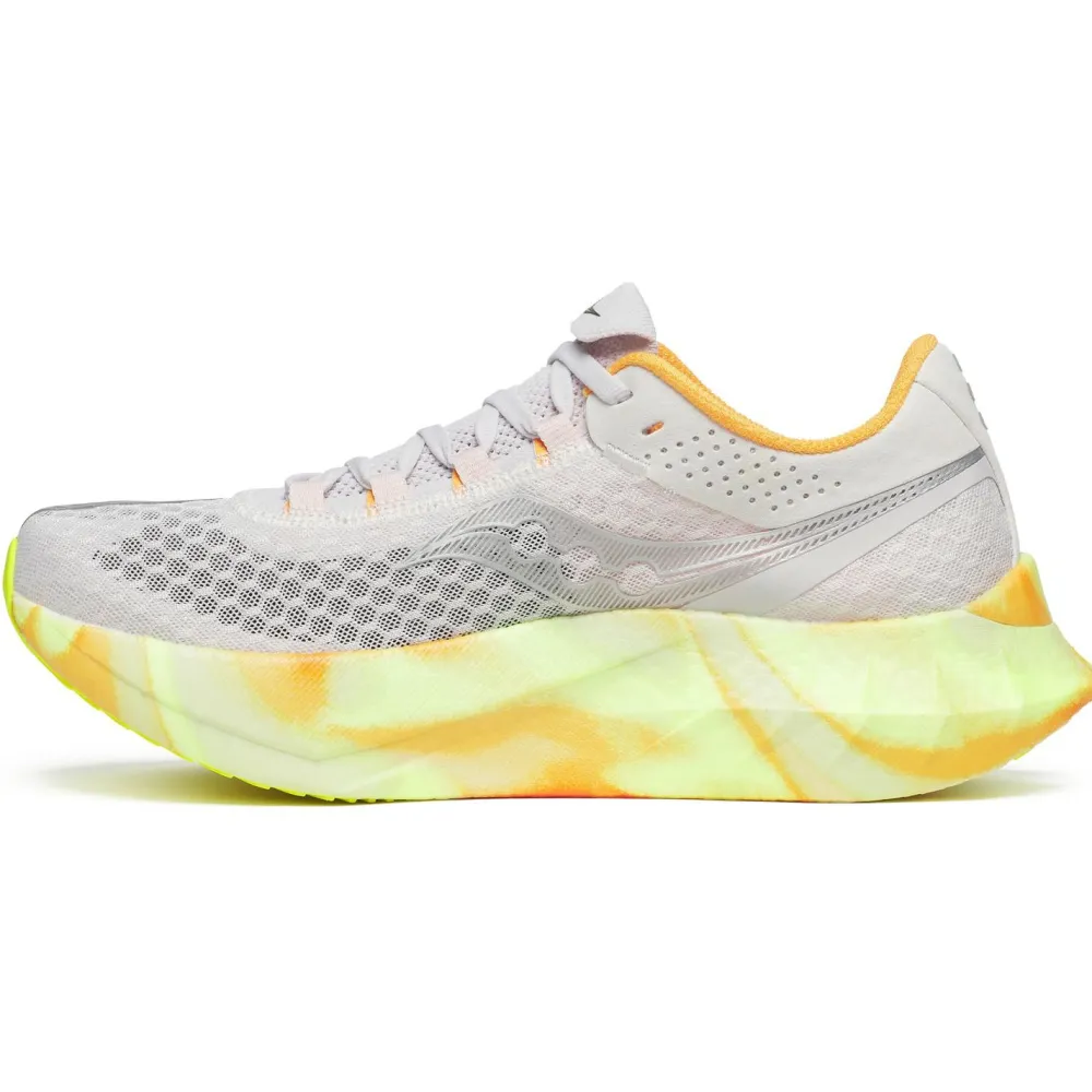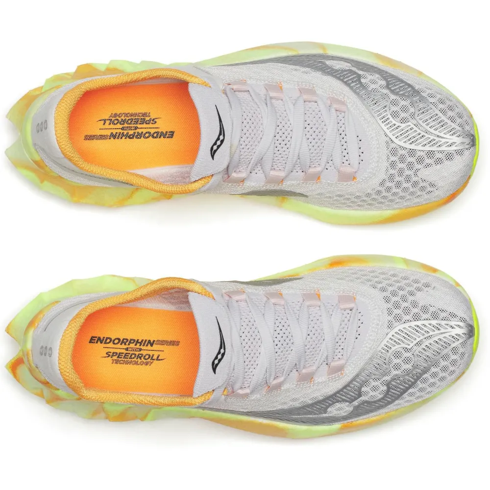 Die Saucony Women’s Endorphin Pro 4 Laufschuhe sind mit einer innovativen Kombination aus Carbonplatte und PWRRUN PB in der Zwischensohle ausgestattet. Diese Technologien optimieren die Energieübertragung und verbessern die Laufökonomie erheblich. Die steife Carbonplatte fungiert als Hebel, der Deine Abstoßbewegung effizienter gestaltet, während das PWRRUN PB-Material in der Zwischensohle eine beeindruckende Energie-Rückführung von 88 % bietet. Das bedeutet, dass Du bei Deinem Geschwindigkeitstraining oder Wettkampf schneller laufen kannst und gleichzeitig Deine physiologische Belastung reduzierst. Besonders auf Asphaltstraßen wirst Du den Unterschied spüren.
