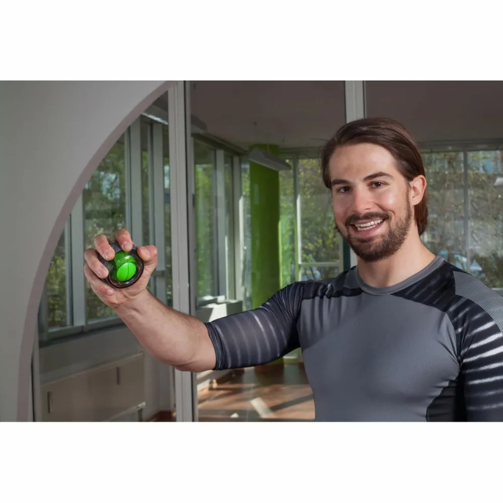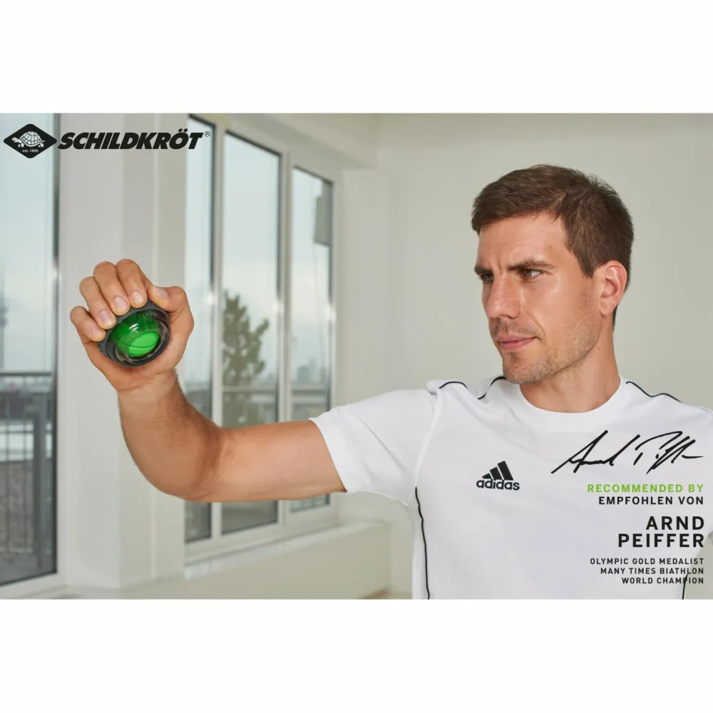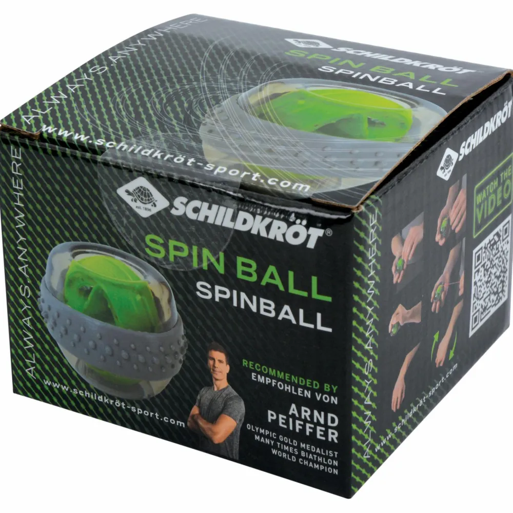 Unter Kletterern und Boulderern schon längst ein beliebtes Spielzeug – der Spinball Hand- und Armtrainer von Schildkröt! Der unscheinbare Ball hat es richtig in sich, denn bringt man den innenliegenden Rotor erstmal richtig zum Drehen, kann dieser auf bis zu 12.000 Umdrehungen pro Minute gebracht werden, wobei Kräfte entstehen, die einem max. Gewicht von 15 kg entsprechen können. Je schwerer der Ball also wird, desto mehr Schmackes gibt es – je nach Haltung und Übung – in Fingern, Unterarm, Bizeps, Trizeps und Schultern. Durch die Rotationsbewegung wird eine Überlastung verhindert und Tiefenmuskulatur trainiert. Da man sich hier richtig konzentrieren muss, kommt auch der wichtigste Muskel des Kletterers nicht zu kurz: das Gehirn!