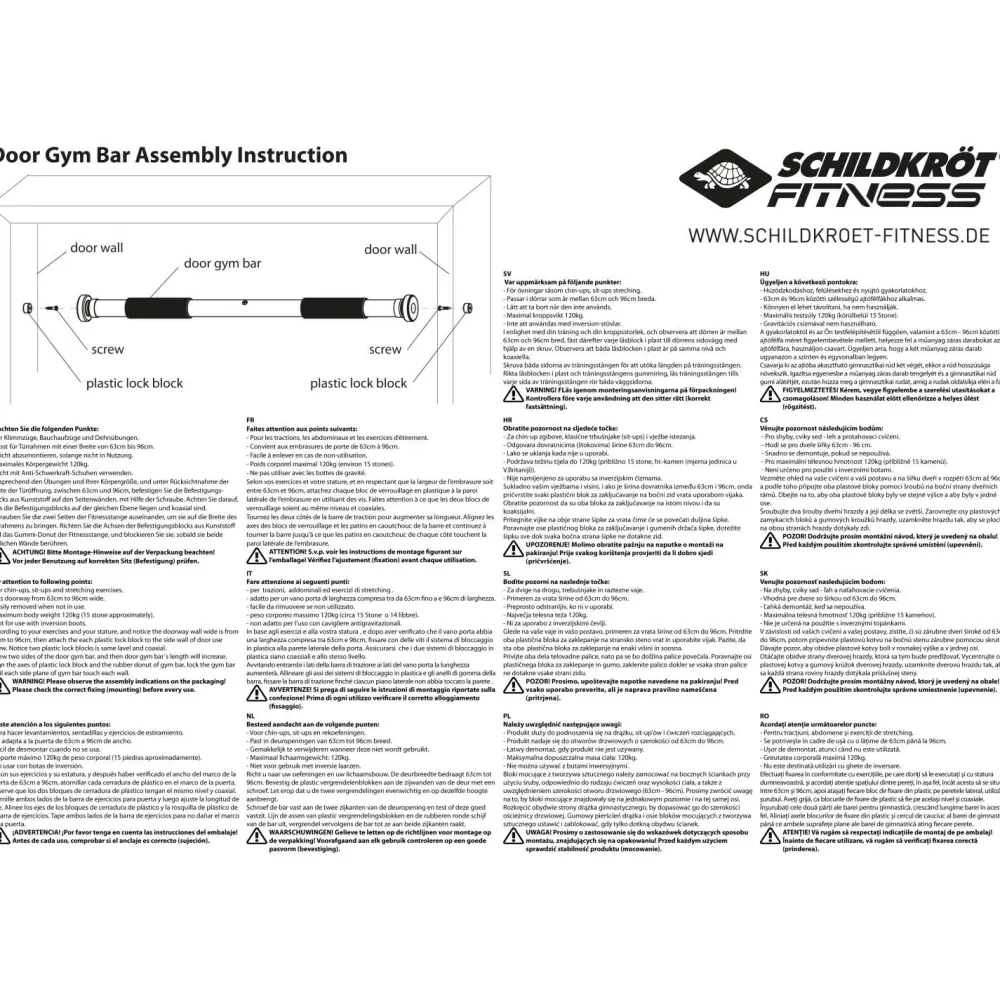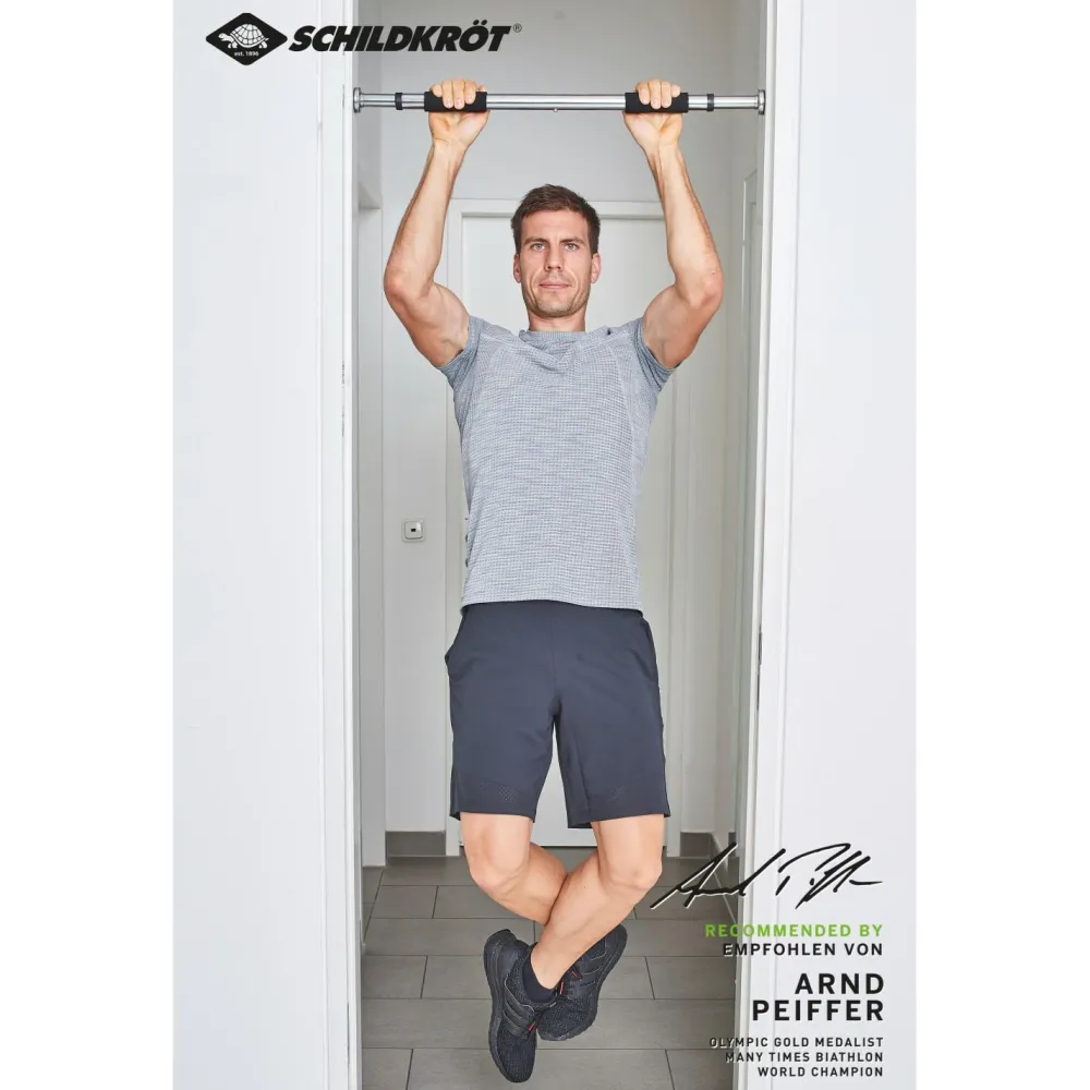 Die Türreck Stange Klimmzugstange von Schildkröt Fitness kannst Du in jeden Türrahmen aufbauen. Mit ihrer verstellbaren Länge von 63 – 96 cm ist sie flexibel einsetzbar und Du kannst sie problemlos mit in den Urlaub nehmen. Die seitlichen Gummiauflagen schonen den Türrahmen und die Schaumstoffgriffe Deine Handflächen.