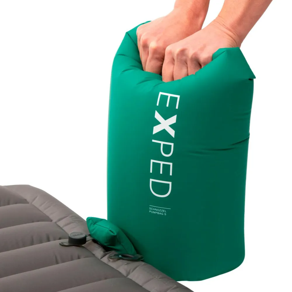 Der Schnozzel Pumpbag von Exped kann gleich mit zwei Funktionen aufwarten: tagsüber kann man ihn als wasserdichten Packsack nutzen, abends wird er dann zum Pumpsack für die Exped Luftmatte. Man benötigt (je nach Matten-Variante) zwischen 2 und 3 Füllungen, um seine Exped Matte aufzublasen. Der Schnozzel Pumpbag ist aus einem robusten 70 Denier Ripstopnylon gefertigt, das den Outdoor-Strapazen problemlos standhält!