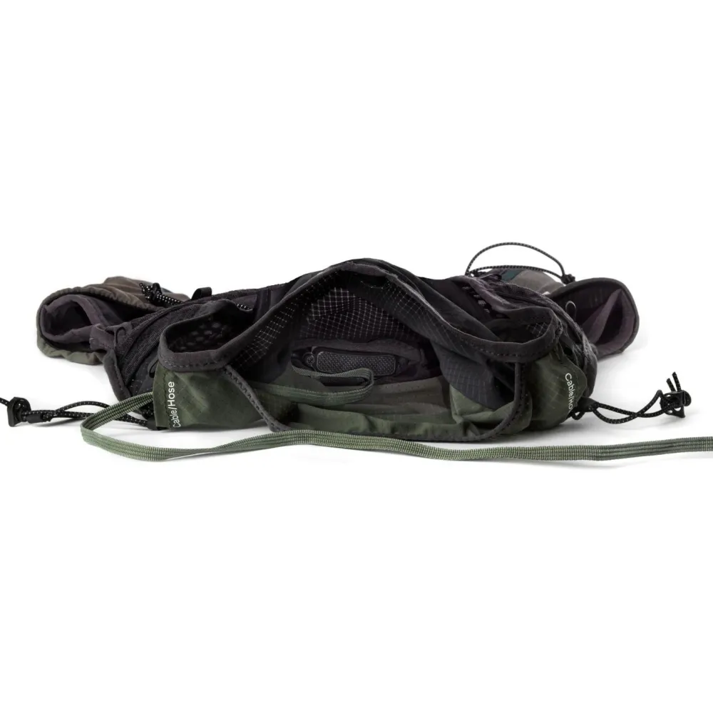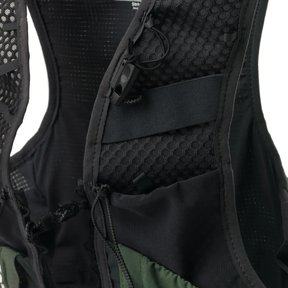 Mit einem Packvolumen von fünf Litern ist die Strive 5 Laufweste sehr leicht und schlank, obwohl sie über eine herausragende Ausstattung mit vielen sinnvoll platzierten Taschen, Fächern und Halterungen verfügt. Zu den Taschen gehören neben Front- und Netztaschen zwei vordere Reißverschlusstaschen und eine Trinkblasen-Rückentasche, in der sich wiederum eine Akkutasche mit Kabelausgängen befindet. Bewegliche und verstellbare Fixiergurte gibt es nicht nur für die Laufstöcke, sondern auch Trinkflaschen und Trinkhalme. Sogar für die Stirnlampe hat die Strive 5 Vest eine spezielle Fixierung auf der Brust!