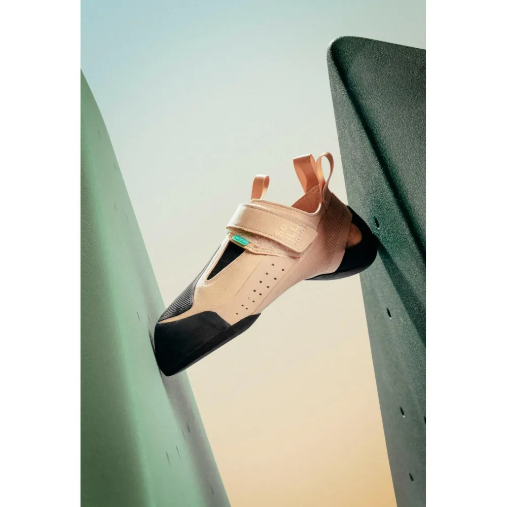 Der Kletterschuh verwendet eine einzigartige Mischung aus Synthetikmaterialien, die sich durch ein angenehmes Tragegefühl auszeichnen. Die Oberfläche des Schuhs bietet dabei ausreichend Atmungsaktivität, um die Füße auch bei längerem Einsatz komfortabel und trocken zu halten. Zudem ist das Obermaterial komplett vegan.