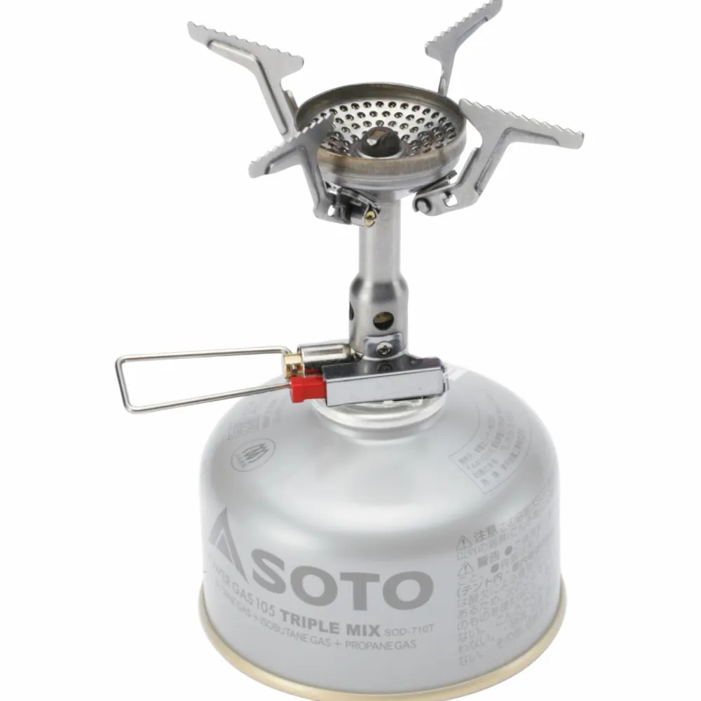 Der leichte Amicus with Stealth Igniter von Soto ist minimalistisch und weist eine starke Leistung auf. Der Brennerkopf besitzt eine konkave Oberfläche und schützt die Flamme damit vor seitlich einfallendem Wind. Die Topfstützen lassen sich einfach ausklappen und rasten sicher ein. In Kombination mit dem Anzünder wird das Kochen auf dem Campingplatz oder beim Trekking zum Kinderspiel. Den leichten Topf mit dem einklappbaren Griff drauf stellen und das fertige Essen genießen. Einfach toll!