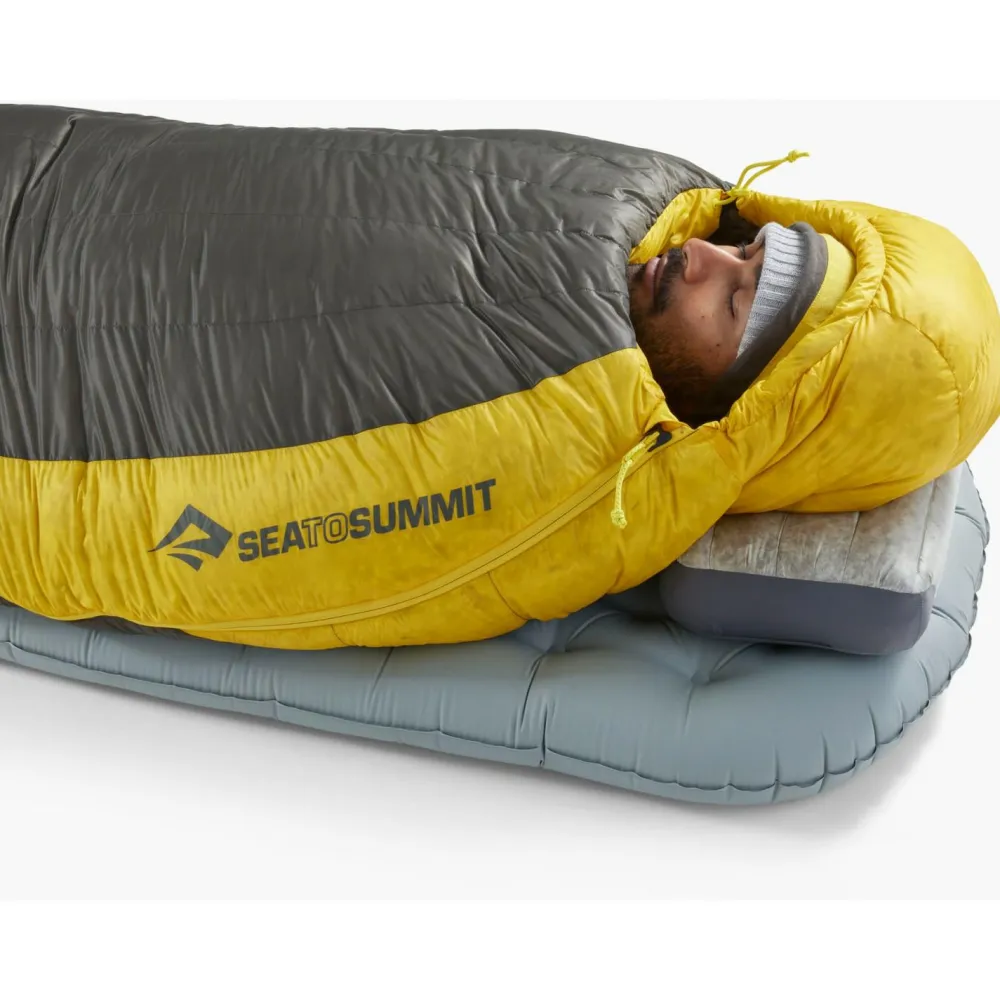 Der Mumienschlafsack ist zwar angepasst geschnitten, lässt Dir aber durch die großzügige Fußbox Platz in diesem Bereich. Und die technische, vergleichsweise tiefe Kapuze bietet Dir sowohl beste Isolationsleistung, als auch gemütlichen Komfort. Darüber hinaus ist der Spark 7° mit den Quilts von Sea to Summit koppelbar. Schließlich bietet vorne ein ergonomisch geformter Wärmekragen zusätzlichen Schutz.