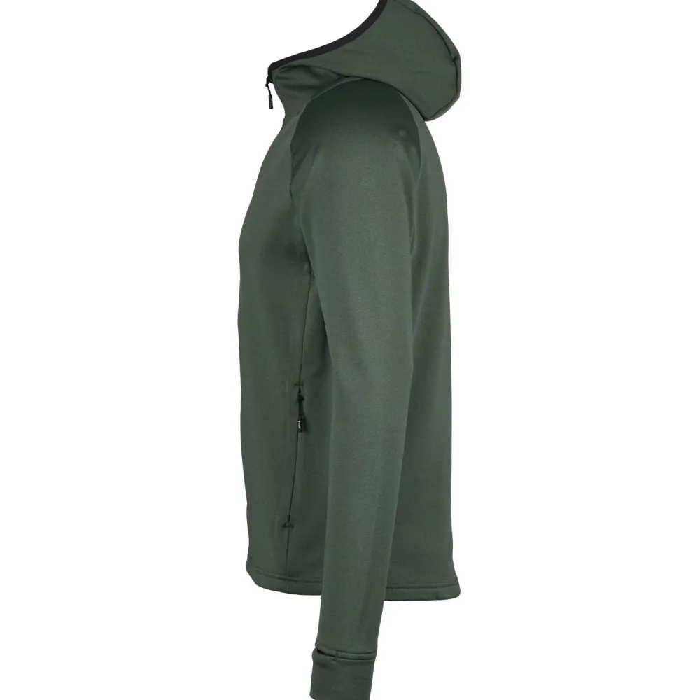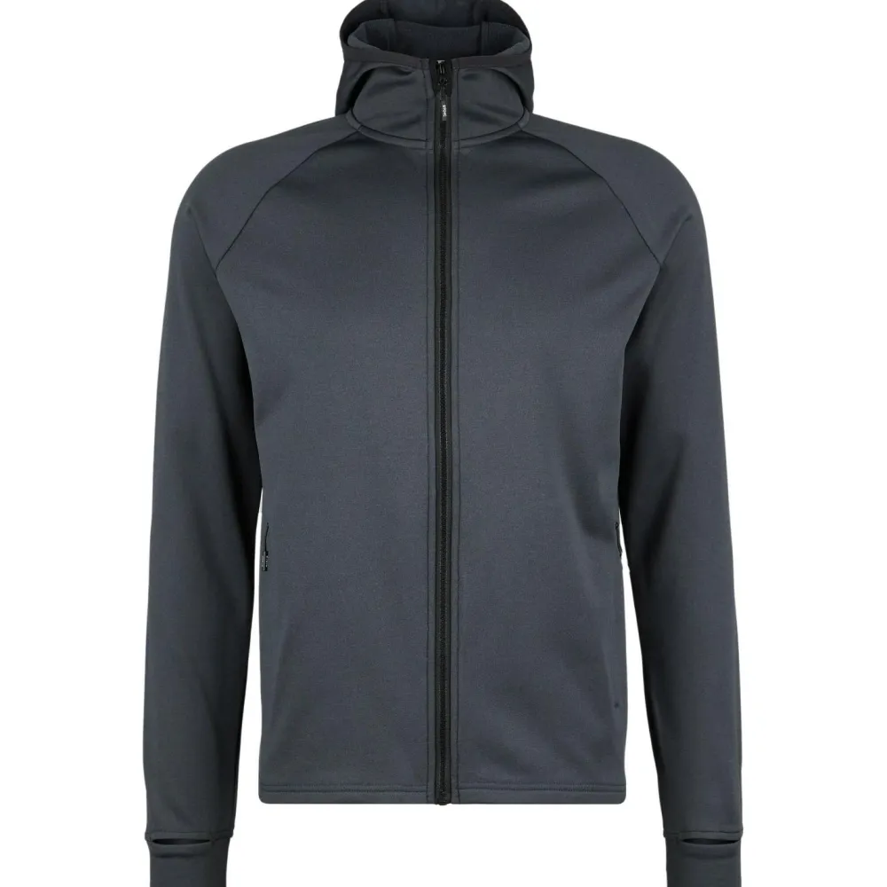 Für zusätzlichen Schutz vor Wind und Kälte sind eine elastisch eingefasste Kapuze und praktische Daumenschlaufen vorhanden. Zwei große Fronttaschen mit Reißverschluss bieten Platz für wichtige Kleinigkeiten, oder um die Hände darin warmzuhalten.