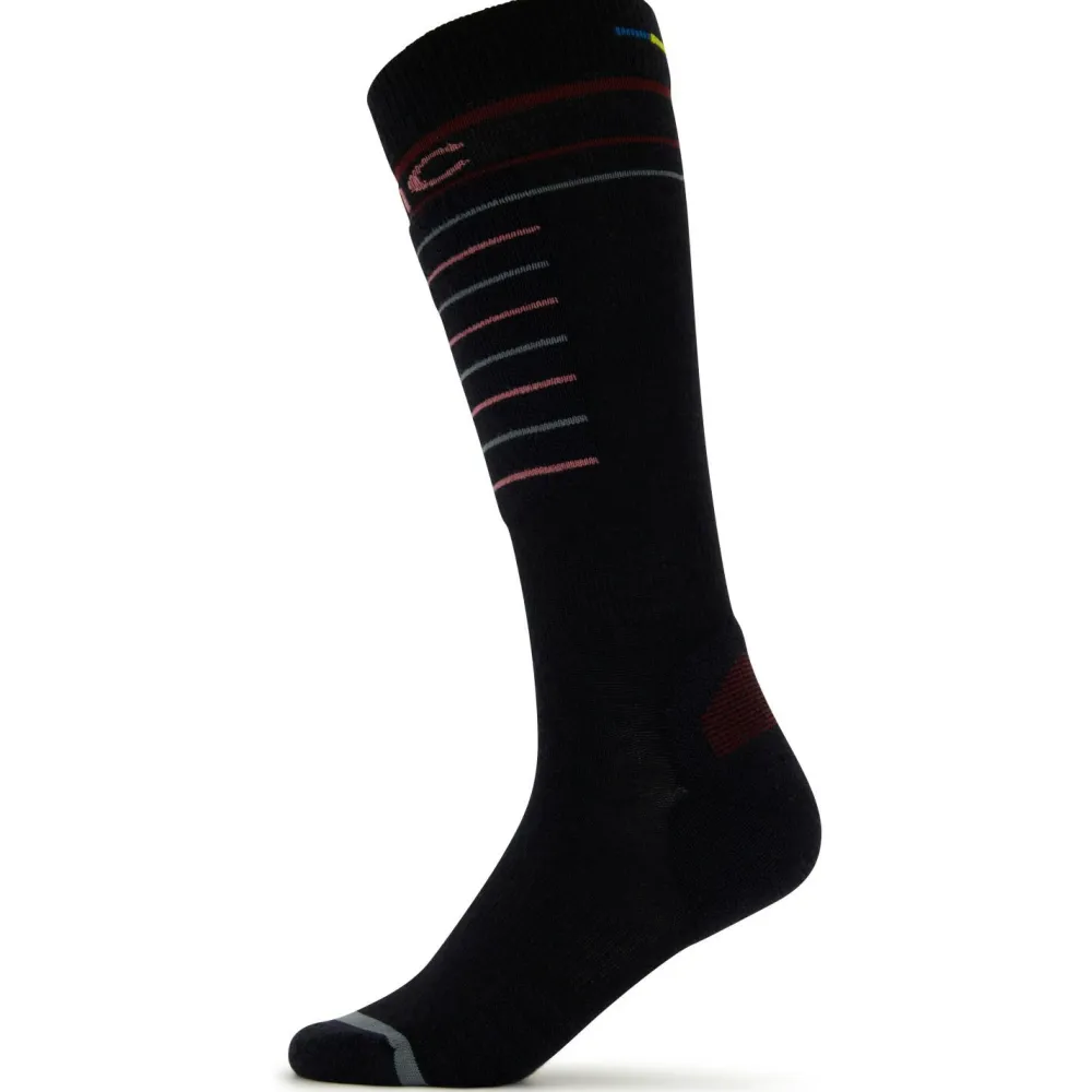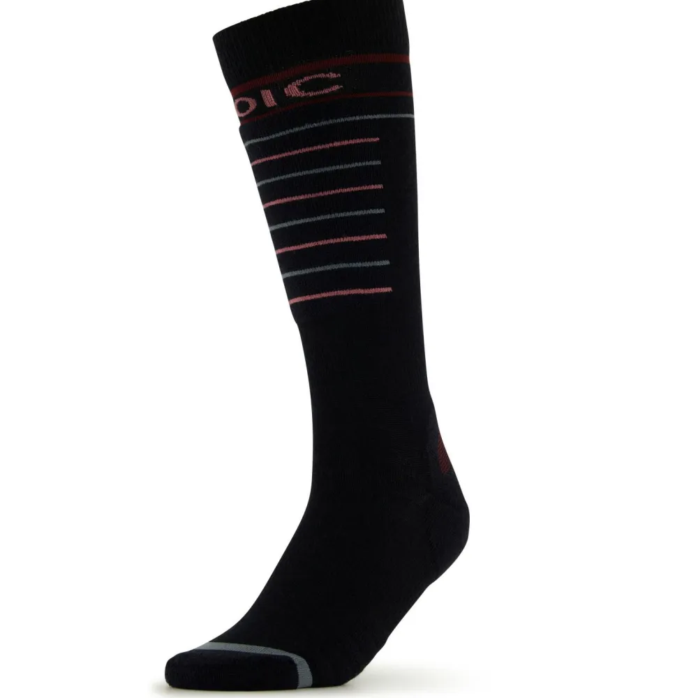 Die Kid’s Merino Ski Socks von Stoic sorgen mit ihrem Wollanteil für warme Füße und nehmen kaum Gerüche an. Mit ihrem langen Schnitt sind sie perfekt für das Tragen in Skischuhe oder Snowboardboots geeignet. An strategisch sinnvollen Bereich sind sie besonders atmungsaktiv und sorgen hierdurch für ein verbessertes Mikroklima. Die verstärkten Fersen bieten zusätzlichen Komfort.