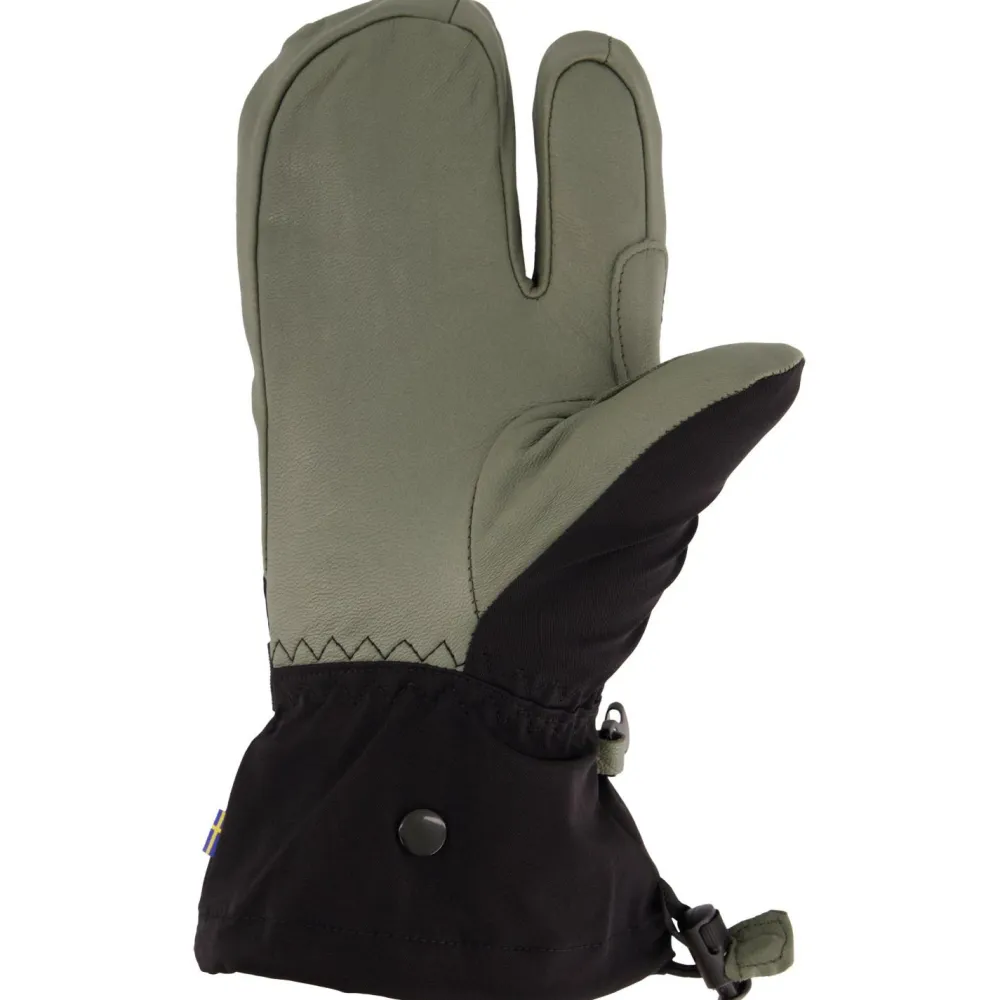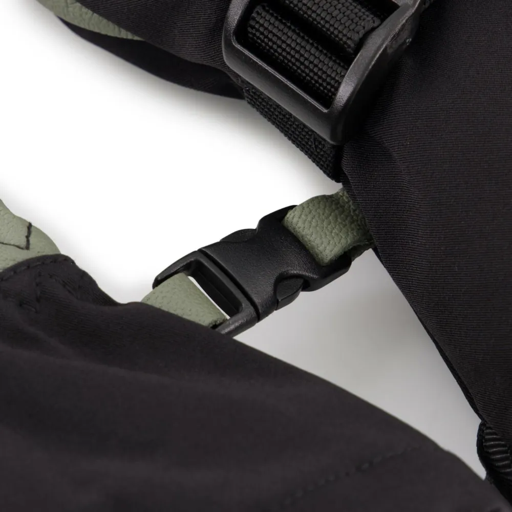 Das Futter sorgt mit seinem Wollanteil für viel Wärme. Hierdurch kann das Gewebe dünner gewählt werden als bei reinen Kunstfaserfuttern, und man erhält ein besseres Greifgefühl bei gleicher Wärmeleistung. Zum Schutz vor Skikanten und Co. ist die Innenhand aus robustem Ziegenleder gefertigt. Die sehr lange Manschette mit Kordelzug und verstellbarem Riemen verhindert das Eindringen von Feuchtigkeit und schließt sauber mit der Skijacke ab, sodass die Hände optimal vor den Elementen geschützt sind.