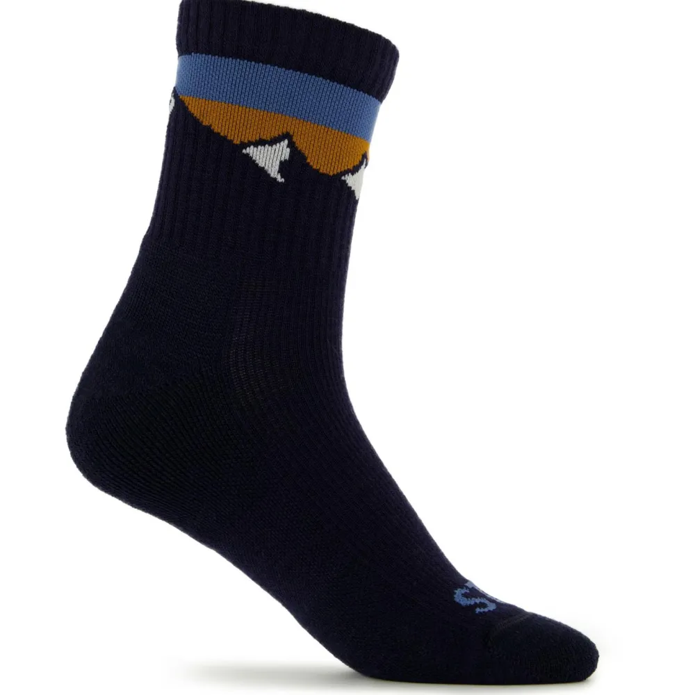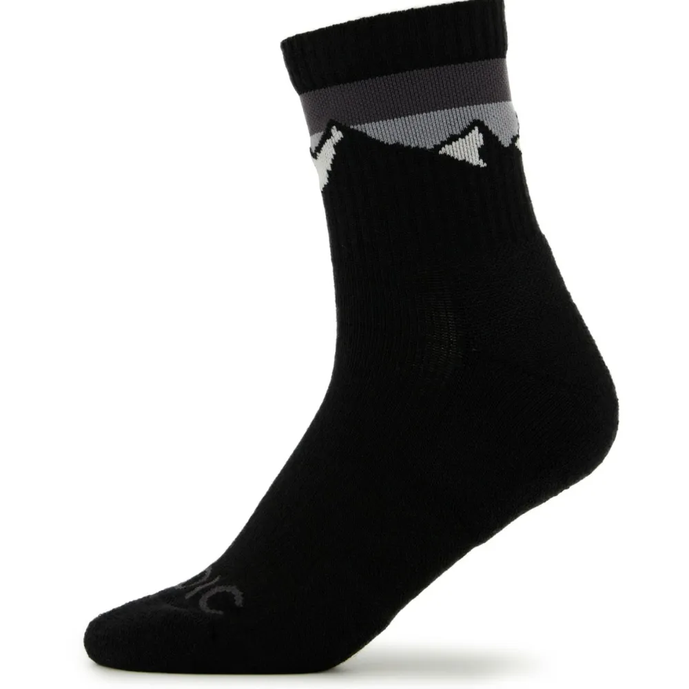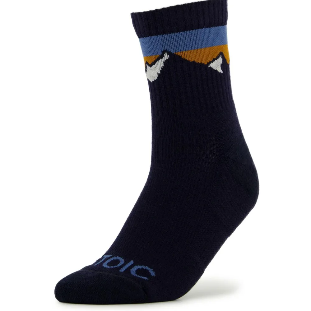Die Merino Quarter Tech Rib Mountains Socks von Stoic überzeugen mit einem funktionalen Materialmix: Der hohe Anteil an Merinowolle hemmt Gerüche, kratzt nicht auf der Haut und ist angenehm atmungsaktiv. In Kombination mit schnelltrocknenden, langlebigen Kunstfasern erhältst Du strapazierfähige Wandersocken mit hohem Tragekomfort, welche Dich beim Wandern und Reisen begleiten werden. Die bunte Bergsilhouette am Schaft sorgt für ein optisches Highlight und sorgt für einen modischen Outdoorlook, der auch im Alltag überzeugen kann.