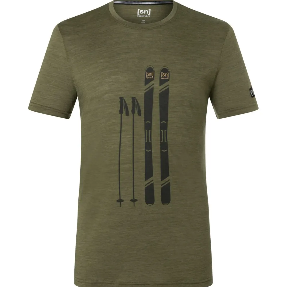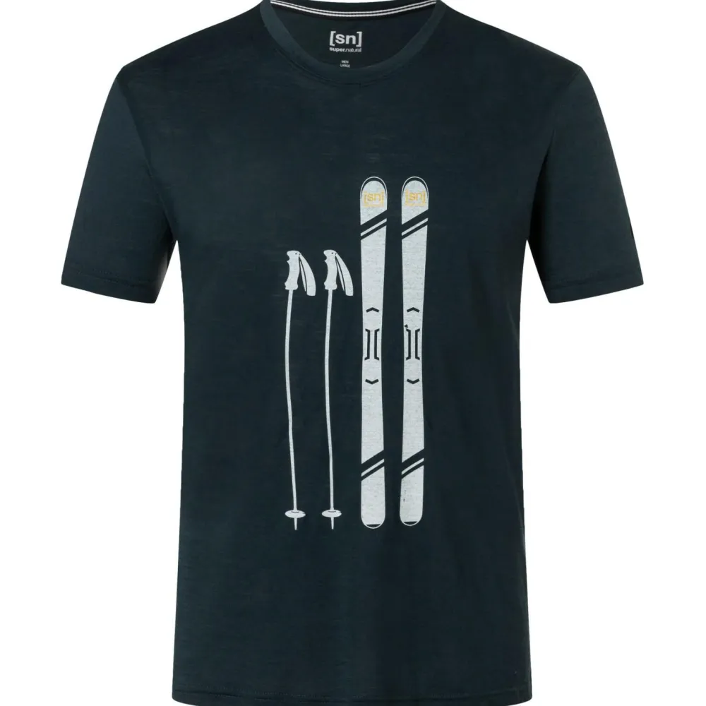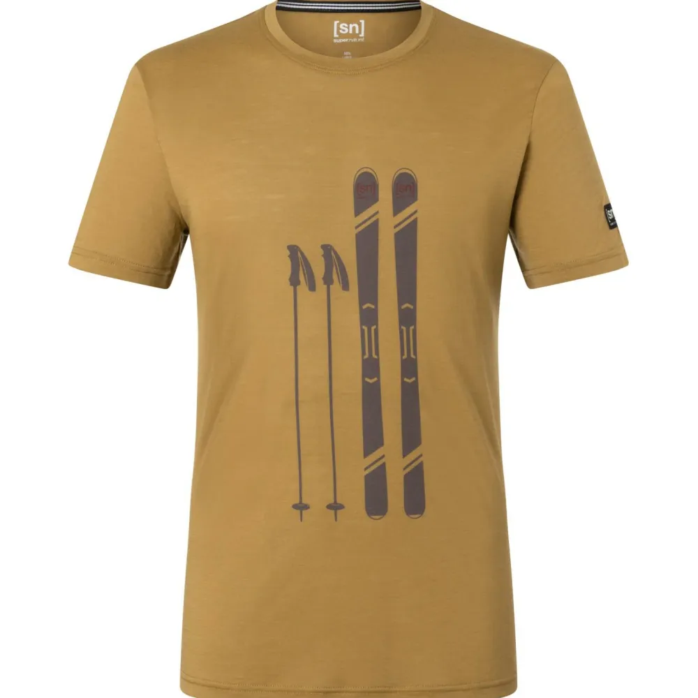 Das Skiing Gear Tee von super.natural fällt dank des Aufdrucks auf der Vorderseite direkt ins Auge. Der macht gute Laune und Lust auf das nächste Abenteuer in den Bergen.