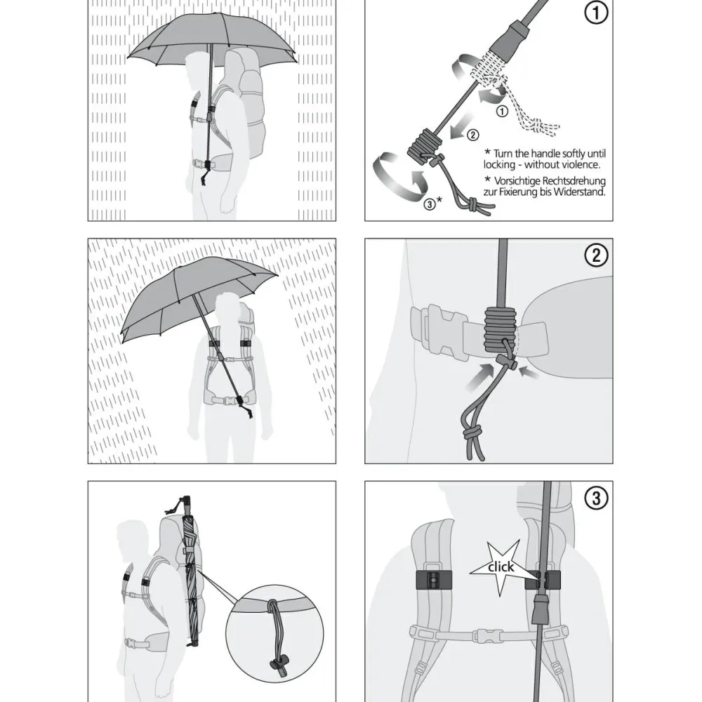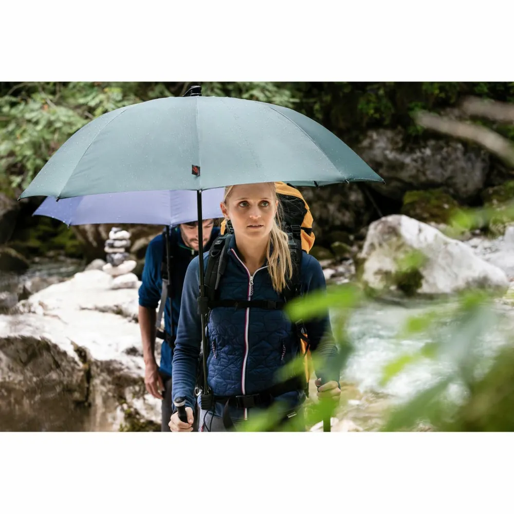 Der Euroschirm Swing Handsfree lässt sich dank des Teleskopstiels unterschiedlich lang ausziehen und durch eine Drehbewegung in jeder Höhenposition fixieren.Mit den zwei Halteclips und einem Klettband kann man den Schirm an den Tragegurten des Rucksacks befestigen. Dabei dient die Handschlaufe am Schirmgriff als Fixierung am Hüftgurt.Egal ob am Rucksack befestigt oder in der Hand gehalten – dieser Schirm lässt einen nicht im Regen stehen!