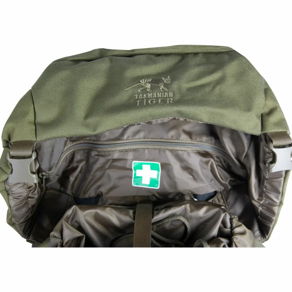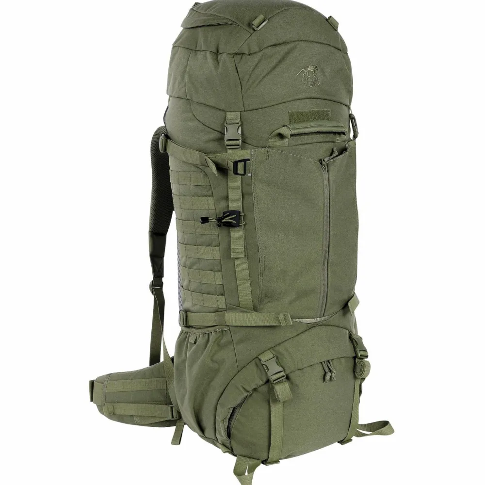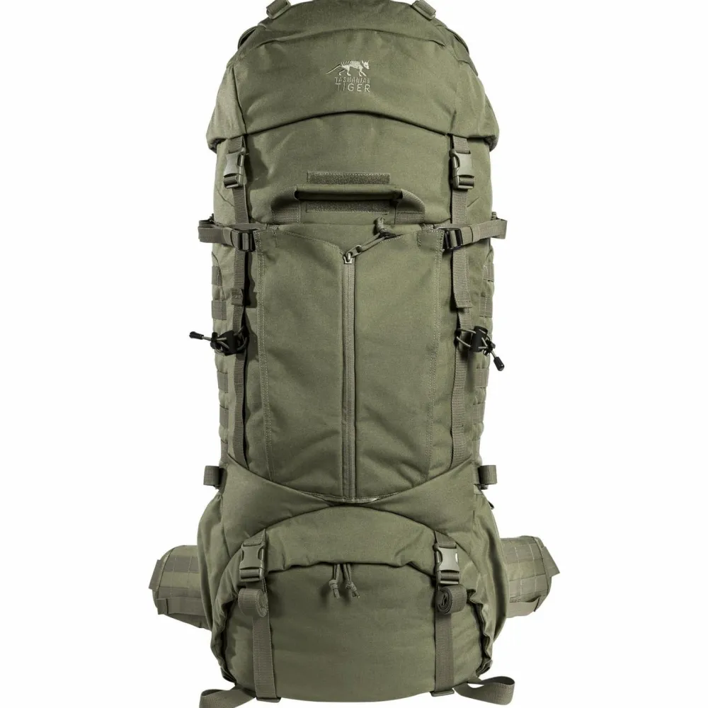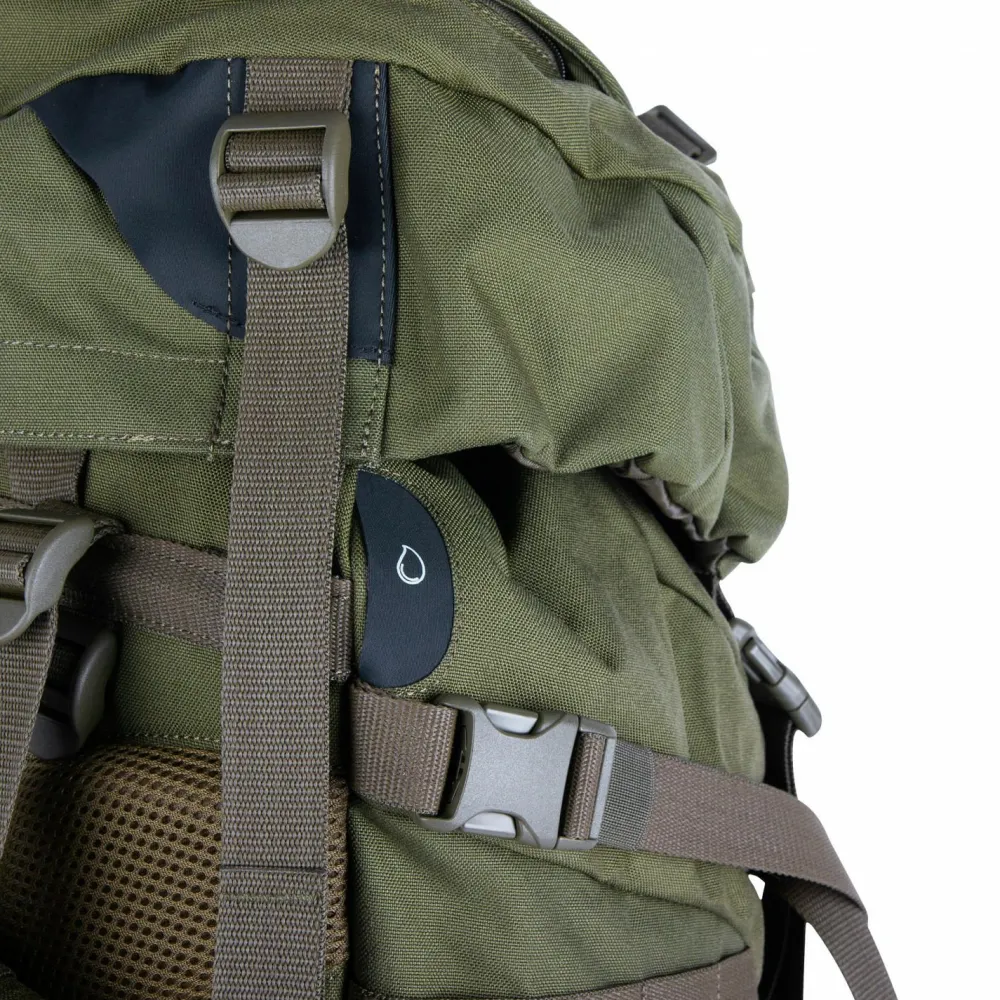 In seinem großen Hauptfach ist ausreichend Platz für Verpflegung und Ausrüstung für mehrere Tage. Das separate Bodenfach ist praktisch für dreckige Wäsche. Der Deckel ist dreifach unterteilt, damit mehr Ordnung herrscht und lässt sich in der Höhe verstellen. So lässt sich der Packraum unkompliziert erweitern. Dank Molle-System lässt sich der Rucksack mit individuellen Erweiterungen versehen. Für den Trinkschlauch gibt es zwei Auslässe. Besonders praktisch ist die vielseitige Fronttasche für Helm oder andere Gegenstände.