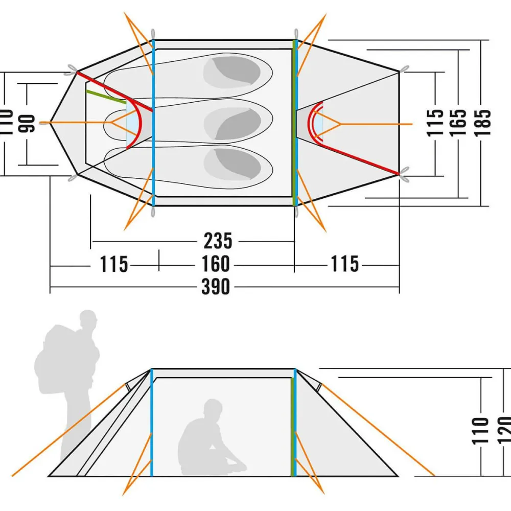 Kompaktes Tunnelzelt mit geräumigem Innenzelt für große Personen – das Arctis 3.235 PU von Tatonka besteht aus einem soliden Außenzelt und einem eingehängtem Innenzelt. Die Verbindung zwischen den Beiden Zelten ermöglicht ein schnelles und reibungsloses Aufbauen selbst unter widrigen Bedingungen. Innen- und Außenzelt können jedoch auf getrennt von einander verstaut werden. Im aufgebautem Zustand gibt es reichlich Platz für drei Personen. In der Apsis mit Fronteingang finden sperrige Gegenstände genügend Platz. Gleichzeitig bietet sie einen überdachten Raum zum Kochen. Das Zelt kann über zwei Eingänge betreten werden, welche sich gleichzeitig öffnen lassen für eine maximale Ventilation an warmen Tagen.Das Außenzelt ist aus strapazierfähigem 75 Den Polyester 185T mit PU-Beschichtung hergestellt. Es hält Wind und Wetter Stand. Alle Nähte sind zusätzlich versiegelt, damit Nässe nicht in den Innenraum gelangen kann.Das Außenzelt wird mit zwei Gestängebögen aus Aluminium aufgestellt. Die großzügige Apsis ist mit einem Fronteingang versehen, über den man komfortabel in den Innenraum gelangt. Mit den reflektierenden Zeltleinen kann das Zelt ringsherum sicher abgespannt werden. In der Dunkelheit bieten sie zusätzliche Sicherheit, damit man nicht ausversehen stolpert. Die Leinen können in den praktischen, integrierten Packhilfen verstaut werden. Alle Eckpunkte am Boden sind mit Gurtbändern verstärkt, sodass auch bei starkem Wind nichts ausreißen kann. Das Arctis 3.235 PU ist ein vielseitiger Begleiter auf anspruchsvollen Touren, bietet viel Platz und clevere Features.