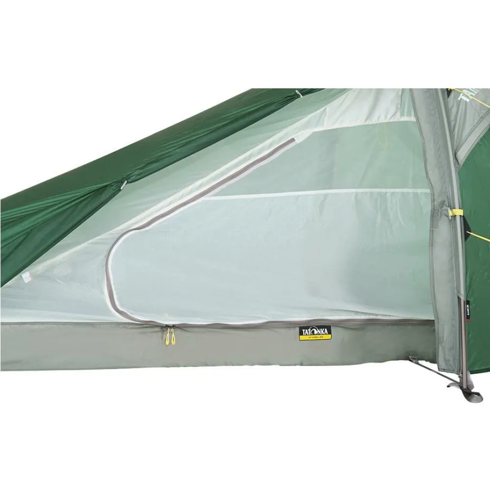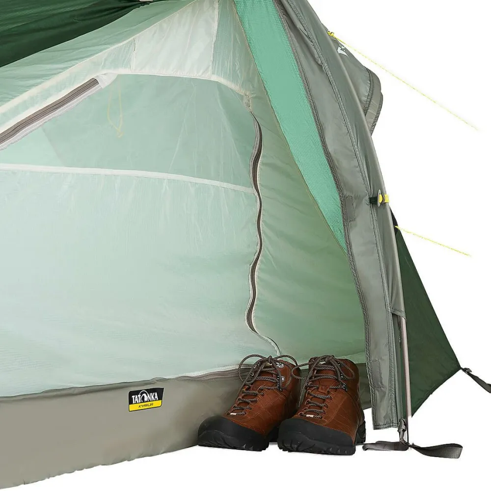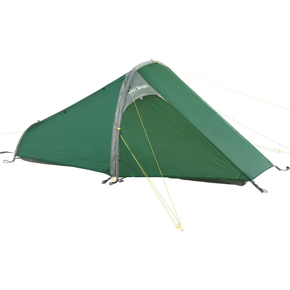 Das Kyrkja 1 Personenzelt von Tatonka ist eine sehr leichte und klein packbare Camping- und Trekking-Solotouren-Unterkunft. Das Tunnelzelt mit Seiteneingang und Apside hat einen zweiten Gestängebogen, der es auch langen Outdoorern ermöglicht, ausgestreckt zu schlafen. Das Kyrkja ist mit seinem ultraleichten Scandium Gestänge schnell und einfach aufgebaut, da Innen- und Außenzelt miteinander gekoppelt sind. Verstärkte Eckpunkte mit Gurtbandschlaufen sorgen dabei für Stabilität und Haltbarkeit. Sollte es beim Abbau regnen, lässt sich das Innenzelt auch aushängen und trocken verstauen. Beim nächsten Aufbau wird dann zunächst das Außenzelt aufgestellt und anschließend das trockene Innenzelt eingehängt.Für angenehm trockenes Innenklima sorgt das Außenzelt aus äußerst reißfestem, 5-fach silikonbeschichtetem Nylon 6.6 Ripstop-Gewebe. Der wasserdichte Zeltboden aus PU-beschichtetem Nylon schützt mit einer Wassersäule von 10.000 mm optimal vor Nässe von unten. Das Innenzelt sorgt mit einem Lüfter für ausreichend Ventilation. Da die Apsis genug Platz für den Trekkingrucksack und andere Ausrüstung bietet, kann man es sich drinnen durchaus gemütlich machen. Die integrierte Wäscheleine im Innenraum sorgt für trockene Socken und hilft beim Ordnung halten. Wer Gewicht und Packmaß minimal halten will, ohne auf verlässliche Robustheit zu verzichten, ist mit dem Kyrkja 1 Personen Zelt von Tatonka bestens versorgt!