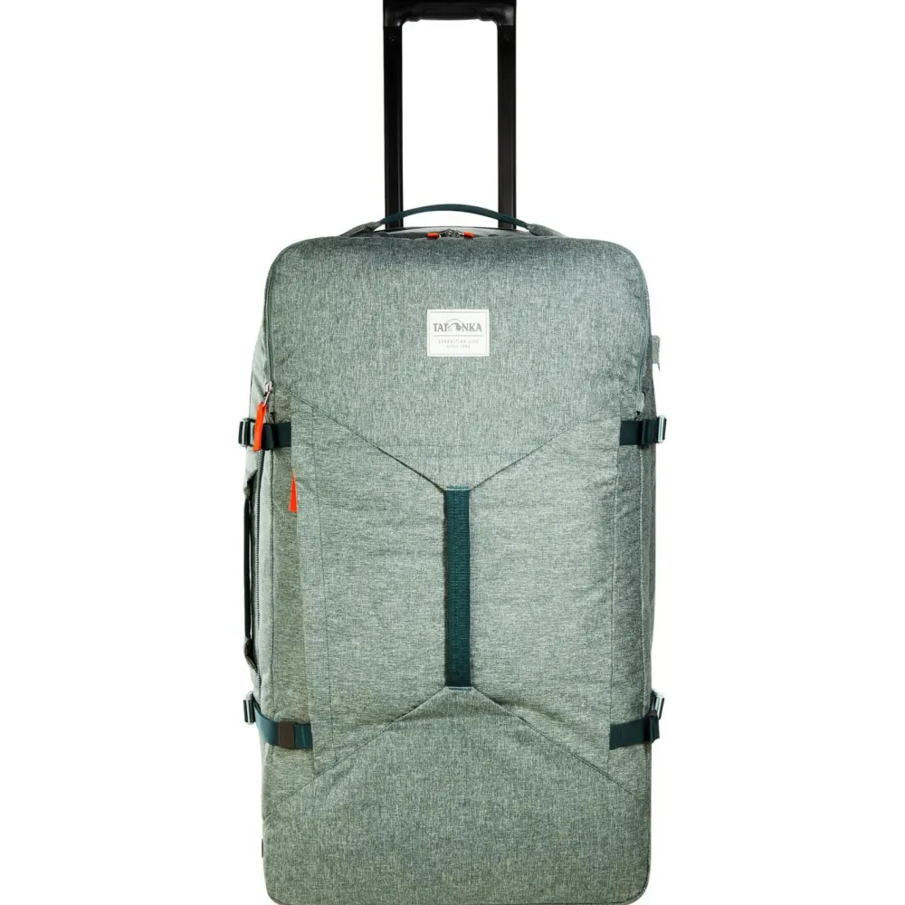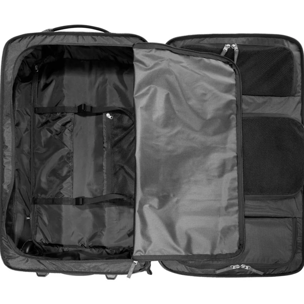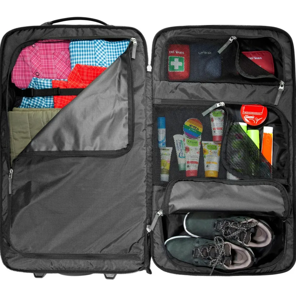 Mit dem Travel Roller 90 von Tatonka reist Du komfortabel und gut organisiert. Der stabile Trolleyrahmen mit leichtlaufenden Rollen und Teleskopgriff sorgt dafür, dass Du auch schweres Gepäck mühelos transportierst. Drei gepolsterte Handgriffe erleichtern Dir das Anheben und Verstauen. Das große Hauptfach mit abschließbarem Reißverschluss lässt sich weit öffnen und bietet Dir viel Stauraum für Kleidung und Ausrüstung.