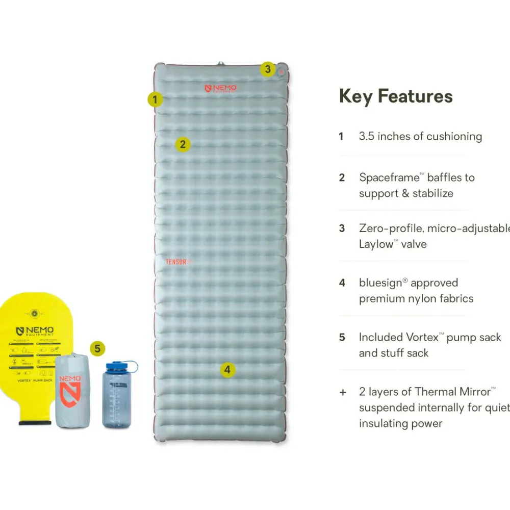 Die Tensor All-Season Isomatte von Nemo ist mit einem Laylow Ventil ausgestattet und wird mit einem Vortex Pump Sack geliefert. So lässt sich die Matte kraftsparend und zügig aufpumpen. Außerdem gelangt dabei keine Feuchtigkeit durch die Atemluft in die Isomatte.