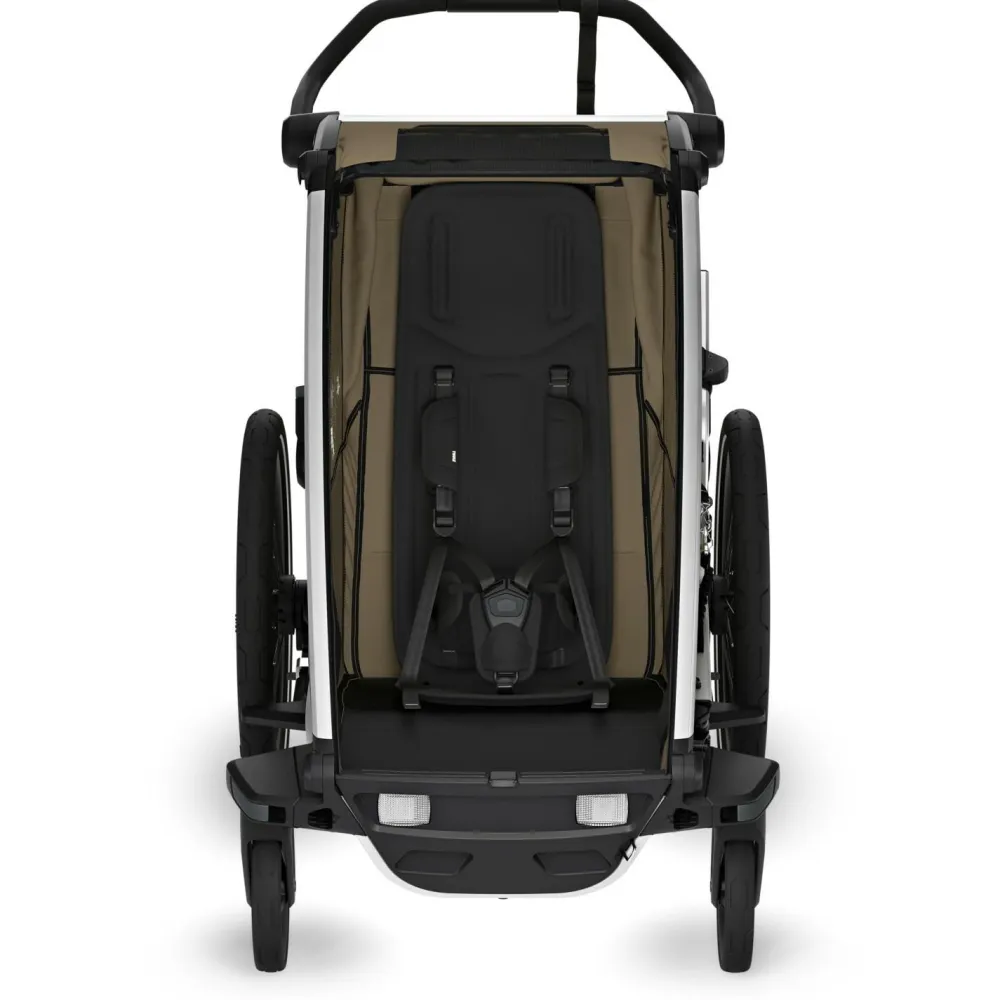Viele Möglichkeiten und viel Platz für GepäckNeben den kleinen Passagieren findet auch das Gepäck seinen Platz. Eine geräumige hintere Gepäcktasche nimmt alles auf, was man unterwegs braucht. Die Tasche kann für mehr Beinfreiheit auch abgenommen und verstaut werden, wenn der Thule Chariot Cross 2 für eine Joggingrunde genutzt wird. Den Wechsel zwischen Radanhänger und Spaziergänger oder Jogger vollzieht man dank des im Lieferumfang enthaltenen Buggy-Sets schnell und einfach. Die beiden Systeme Thule Click n’ Store und Thule VersaWing machen das Ganze zu einer Sache von wenigen Handgriffen. Zudem ist der ergonomische Schiebebügel für den „Buggy Modus“ verstellbar, sodass er sich beim Gehen oder Joggen in optimaler Greifposition befindet.