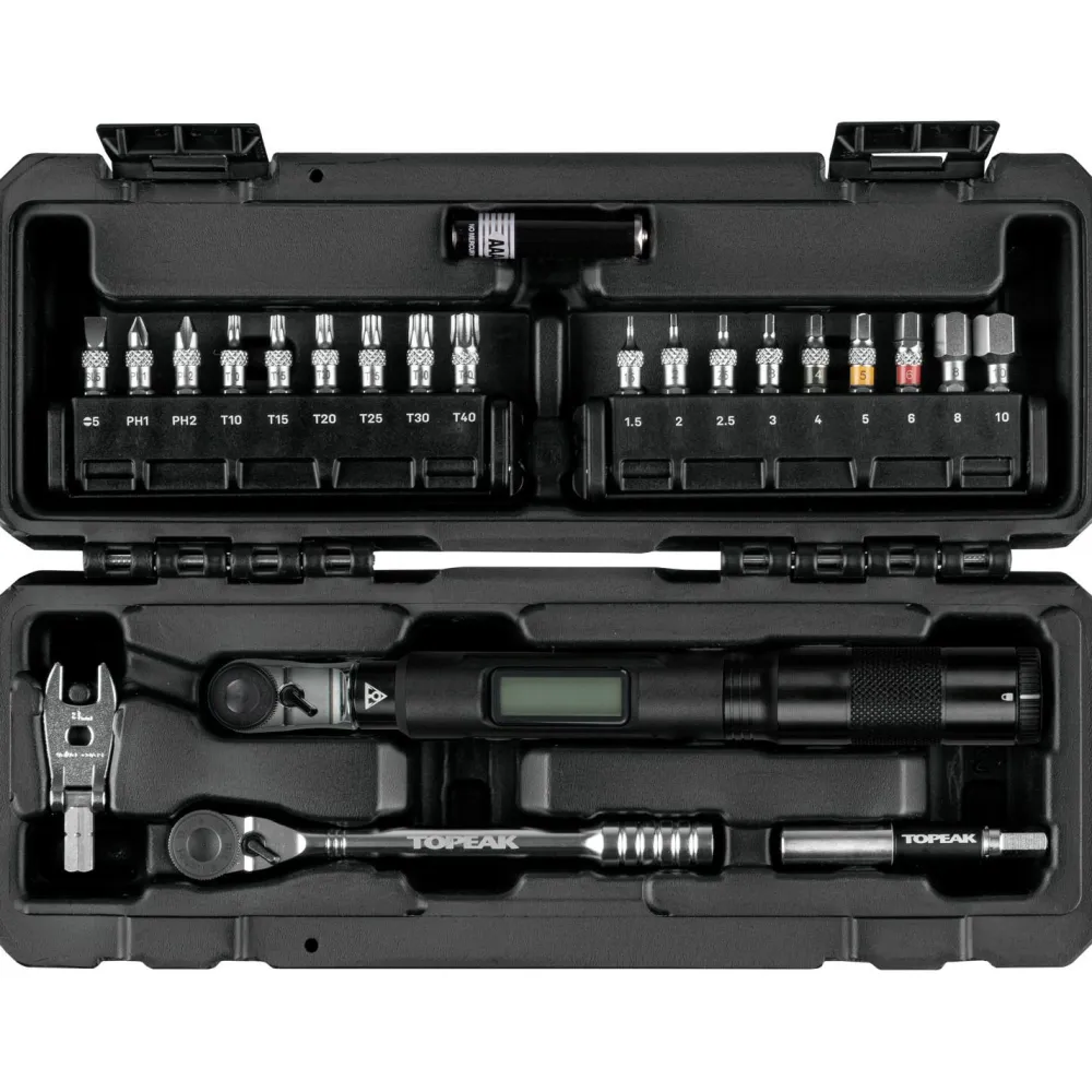 Das Torq Stick Pro Digital Werkzeug-Set von Topeak ist Dein universelles Werkzeugset für präzise Wartungsarbeiten. Der digitale Drehmomentschlüssel mit hintergrundbeleuchtetem Display und Alarmfunktion garantiert exaktes Anziehen bis 20 Nm. Ergänzt durch einen 8 mm Maulschlüssel für empfindliche Überwurfmuttern von hydraulischen Scheibenbremsen, vielseitige Bits und die magnetische Speed Sleeve-Bithalterung. Alles kompakt in einer robusten Transportbox – perfekt für Werkstatt und unterwegs.
