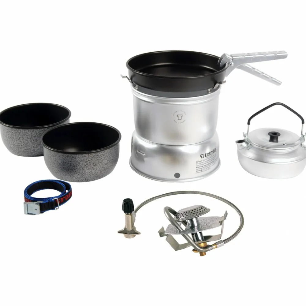 Die Kocherserie 25 Ultralight von Trangia umfaßt Kocher, die sich bestens dafür eignen, für drei bis vier Personen zu kochen. Mit hochgeklappten Halterungen im oberen Windschutz der Sets, kann zudem das größere Kochgeschirr aus dem Trangia Sortiment verwendet werden. Die Sets gibt es außerdem in zwei Varianten: in Ultralight Aluminium und Ultralight Aluminium Hardanodized. Der Trangia 25-6 besteht aus zwei Non-Stick beschichteten Töpfen (1,75 l und 1,5 l), einer Non-Stick beschichteten Bratpfanne (Ø 22cm), oberem und unterem Windschutz, Primus Gasbrenner, Zange, Riemen und zusätzlich einem Wasserkessel mit 0,9 l Fassungsvermögen.Sämtliche Sturmkocher der Trangia 25 Serie sind auch mit Spiritusbrenner erhältlich.Die Variante Ultralight wird aus einer neuen Aluminiumlegierung hergestellt, die zu 50% stärker ist, als herkömmliches Aluminium. Das erlaubt den Bau von dünnwandigeren und damit leichteren Gefäßen. Deshalb punkten die neuen Trangia Modelle mit einem Gewichtsvorteil von bis zu 25% im Vergleich zu ihren Vorgängern!Ultralight Hardanodized ist eine ausgesprochen verschleißfeste Aluminiumlegierung. Durch Hartanodisierung erhöht sich die Kratz- und Verschleißfestigkeit, sowie die Korrossionsbeständigkeit. Diese Oberflächenbehandlung erleichtert zudem die Reinigung der Gefäße! Aufgrund seiner hervorragenden Eigenschaften ersetzt dieses Material sowohl die Titanium-, als auch die Duossal-Kocher.Non-Stick ist eine Beschichtung, die sich besonders gut zum Braten mit und ohne Fett eignet. Nichts brennt an, was zusätzlich die Reinigung erleichtert. Non-Stick ist allerdings etwas empfindlicher gegen Kratzer und Verschleiß, weshalb es sich empfiehlt, nur Kuststoff- oder Holzbesteck zu verwenden.