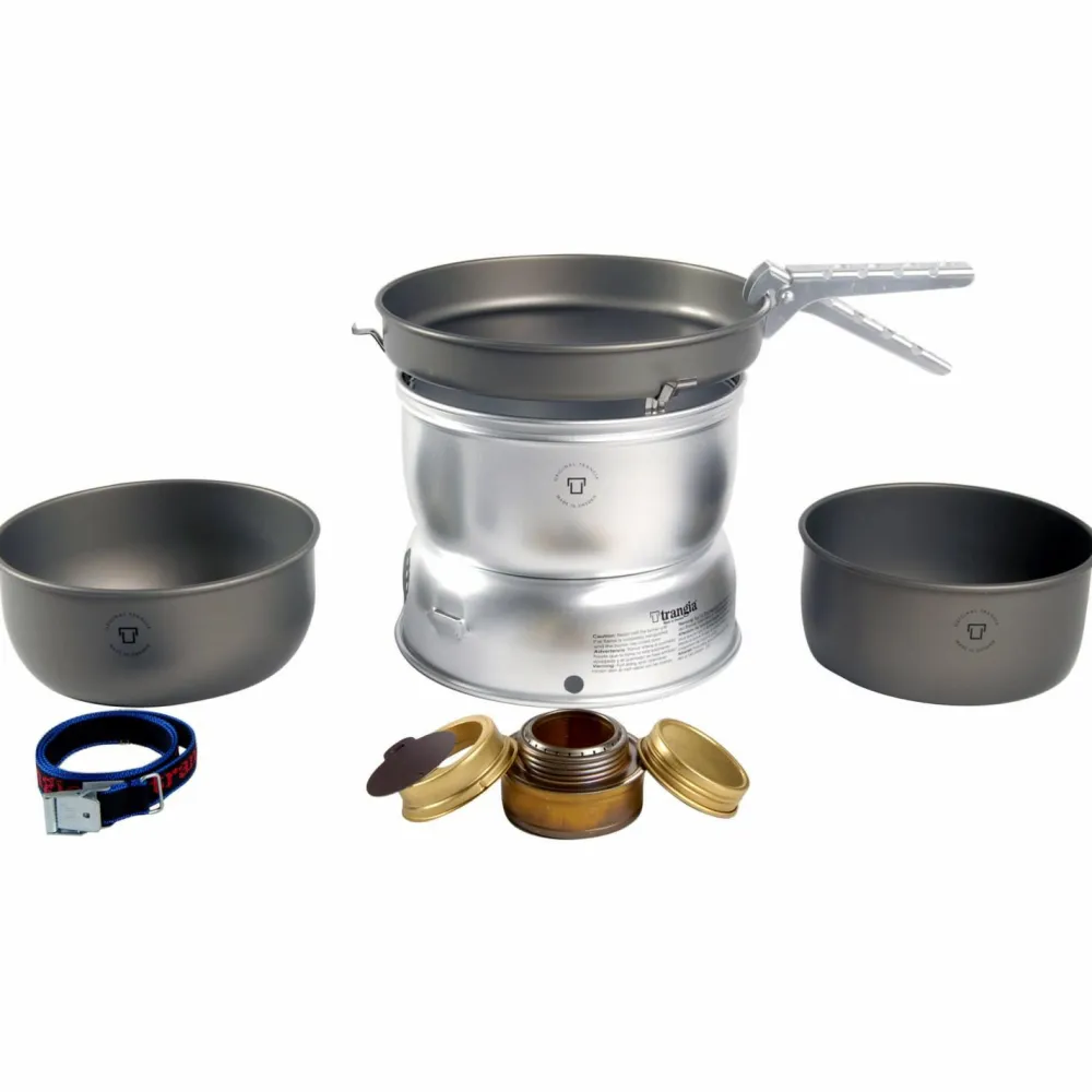 Die Kocherserie 25 Ultralight von Trangia umfaßt Kocher, die sich bestens dafür eignen, für drei bis vier Personen zu kochen. Mit hochgeklappten Halterungen im oberen Windschutz der Sets, kann zudem das größere Kochgeschirr aus dem Trangia Sortiment verwendet werden. Der Trangia 25-7 ist eine Set-Variante mit 2 Töpfen (1,75 l und 1,5 l) und einer Bratpfanne (Ø 22cm) aus Ultralight Hardanodized Aluminium. Der obere und untere Windschutz sind aus unbehandeltem Ultralight Aluminium. Das Set kommt zudem mit einem Spiritusbrenner, Zange und Riemen.Sämtliche Sturmkocher der Trangia 25 Serie sind auch mit Gasbrenner erhältlich.Das Material Ultralight Aluminium wird aus einer neuen Aluminiumlegierung hergestellt, die zu 50% stärker ist, als herkömmliches Aluminium. Das erlaubt den Bau von dünnwandigeren und damit leichteren Gefäßen. Deshalb punkten die neuen Trangia Modelle mit einem Gewichtsvorteil von bis zu 25% im Vergleich zu ihren Vorgängern!Ultralight Hardanodized ist eine ausgesprochen verschleißfeste Aluminiumlegierung. Durch Hartanodisierung erhöht sich die Kratz- und Verschleißfestigkeit, sowie die Korrossionsbeständigkeit. Diese Oberflächenbehandlung erleichtert zudem die Reinigung der Gefäße! Aufgrund seiner hervorragenden Eigenschaften ersetzt dieses Material sowohl die Titanium-, als auch die Duossal-Kocher.
